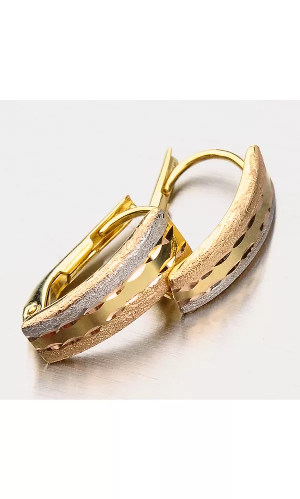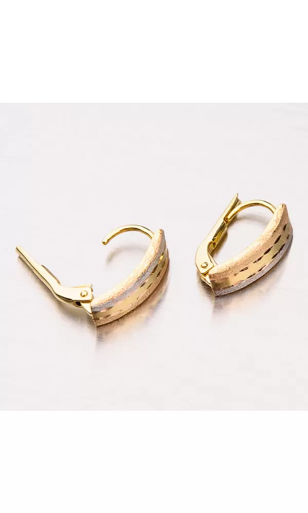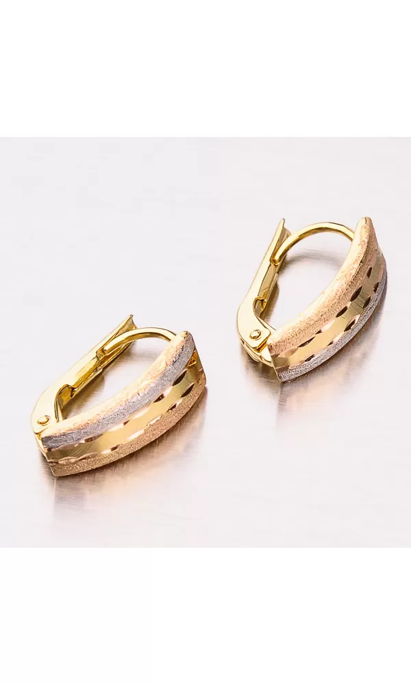 Tento originální design těchto náušnic vás upoutá. Je použita červená, žlutá i bílá barva zlata. Jsou tvořeny barevné pruhy, které jsou rozděleny gravírováním. Náušnice jsou v kombinaci matné a lesklé povrchové úpravě aby vynikly barevné kombinace. Výhodou těchto náušnic je váha. Jsou lehoučké a tak je na uchu ani neucítíte. Náušnice se zapínají na klapku.