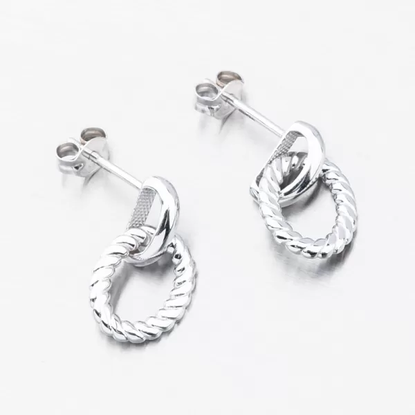 Originální design dámských náušnic z bílého zlata zlata je tvořen z dvou spojených částí. Spodní oválný kruh je zdobený vroubkovaným povrchem a visí na horním půlkruhu u zapínání.