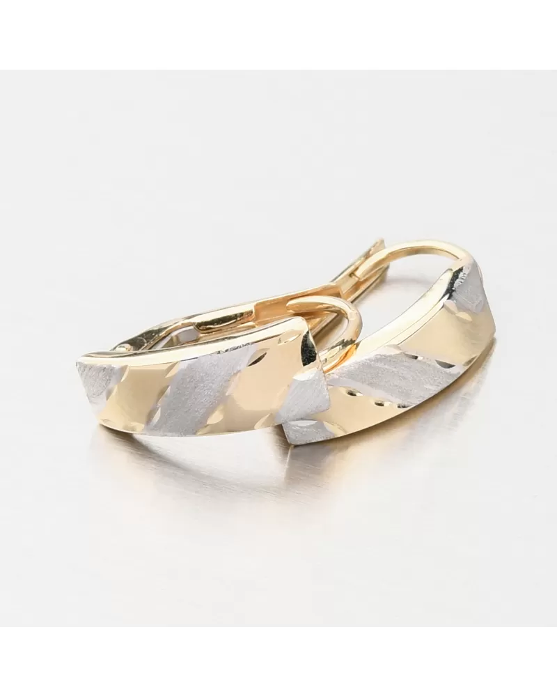 Elegantní zlaté náušnice s nádhernými odlesky. I když náušnice nemají žádné zirkony nádherně se třpytí a to díky facetám, kterými jsou na přechodech mezi žlutou a bílou barvou zlata. Facety jsou lesklé plošky dělané za pomocí diamantového hrotu a dodávají šperku maximální lesk a brilanci ze všech úhlů. Žlutá barva zlata je ve vysokém lesku, bílá barva je v matu.