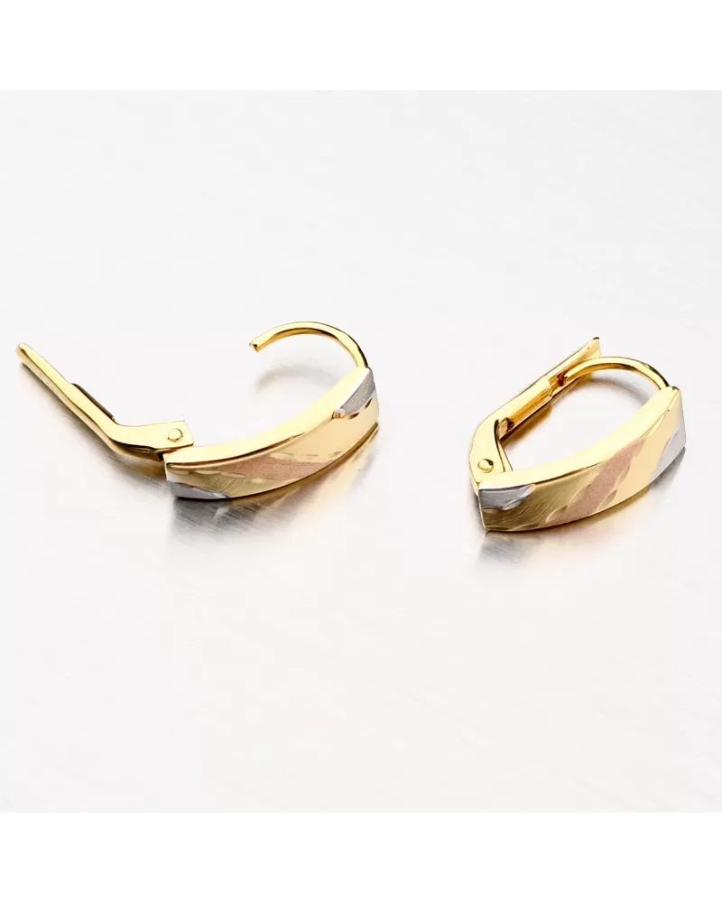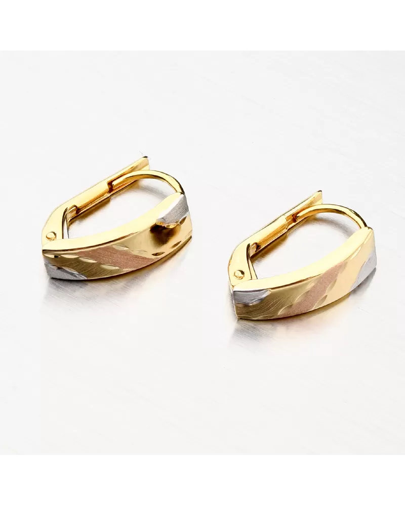 Elegantní dámské náušnice se zapínáním na klapku budou vhodné pro všechny příležitosti. Náušnice jsou zdobeny přední stranou, která je ze šikma rozdělena na pruhy. Některé z pruhů jsou opatřeny bílou a růžovou barvou zlata s matnou povrchovou úpravou. Náušnice zdobí také gravírování. Gravírování je provedeno diamantovým rycím hrotem, který zajišťuje nejvyšší možný lesk gravírovaných facet.