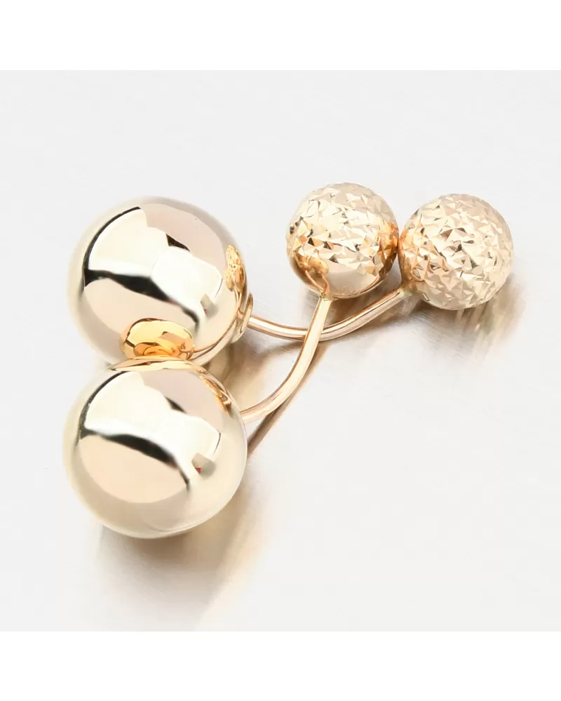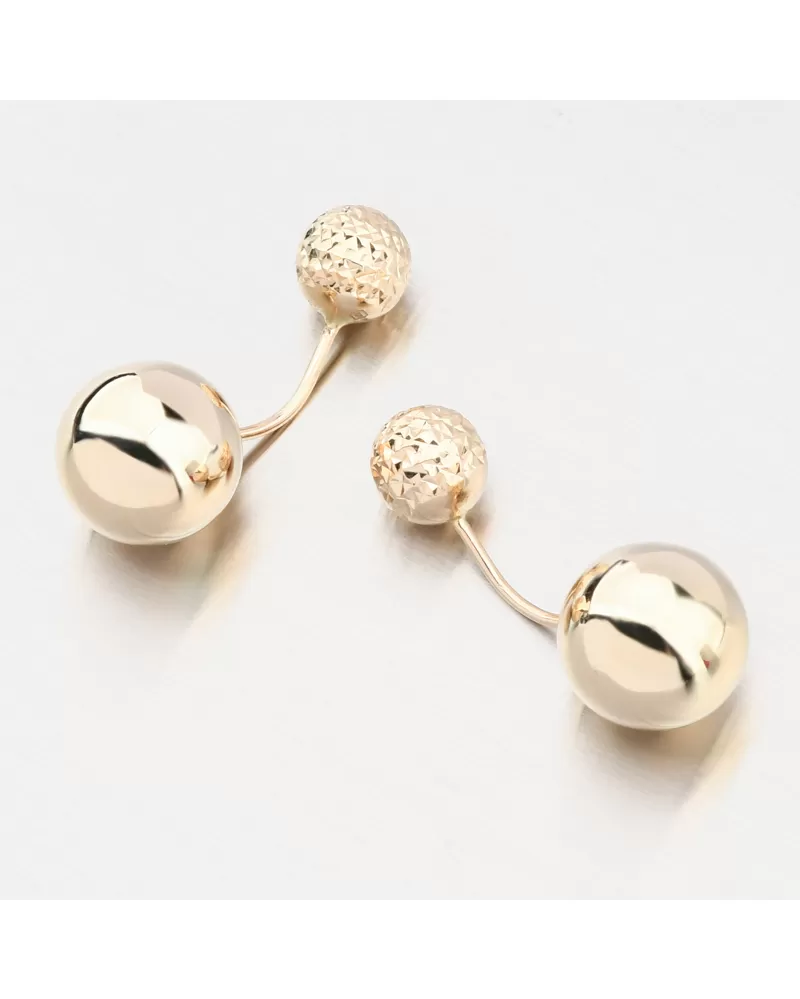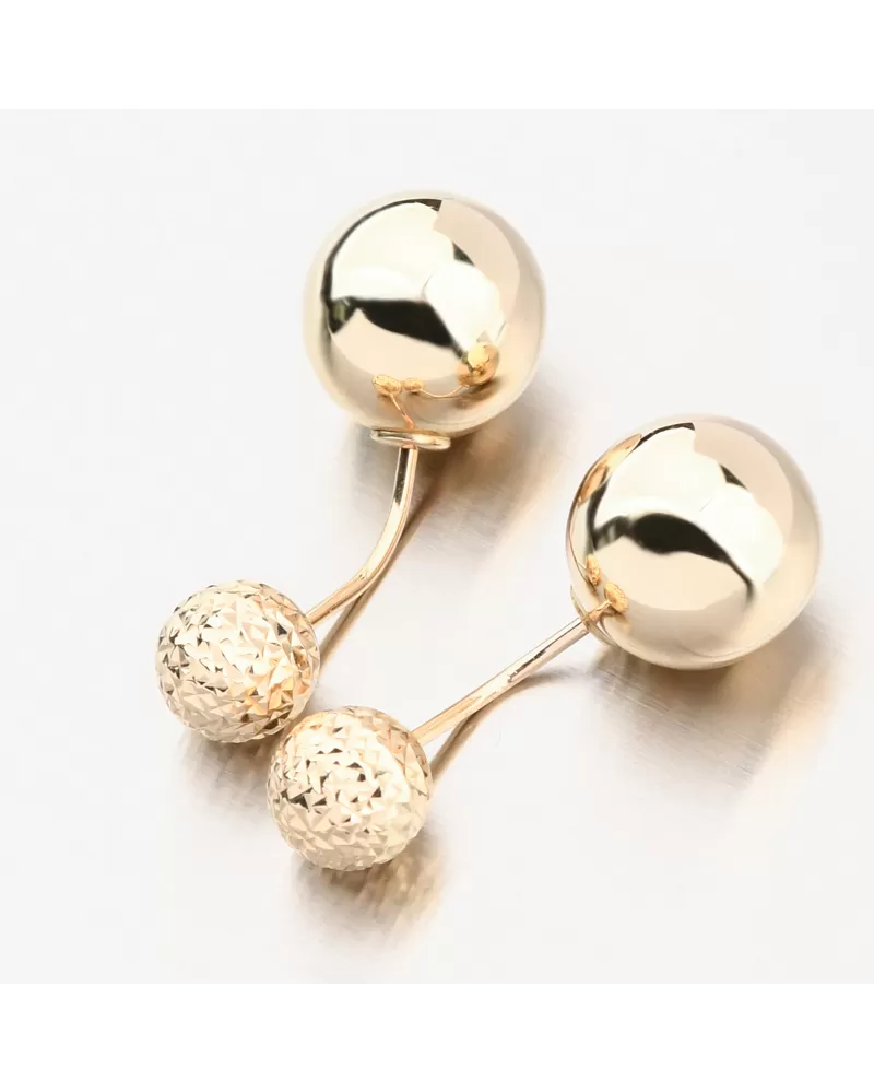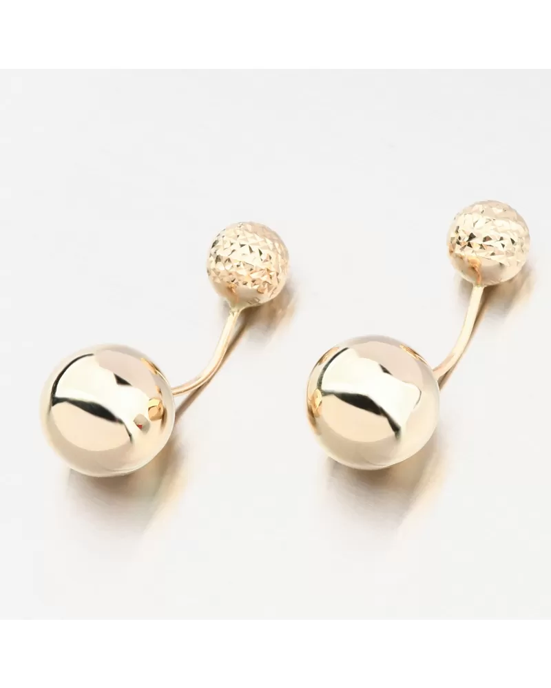 Luxusní zlaté náušnice, které jsou velkým trendem v nošení šperků. Náušnice zdobí dvě koule, jedna je větší ve vysokém lesku a druhá menší zdobená a zvýrazněna nádherným gravírováním. Gravírování je provedeno diamantovým rycím hrotem, který zajišťuje nejvyšší možný lesk gravírovaných facet.