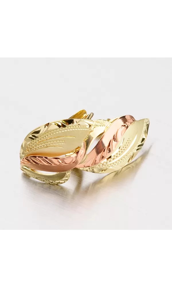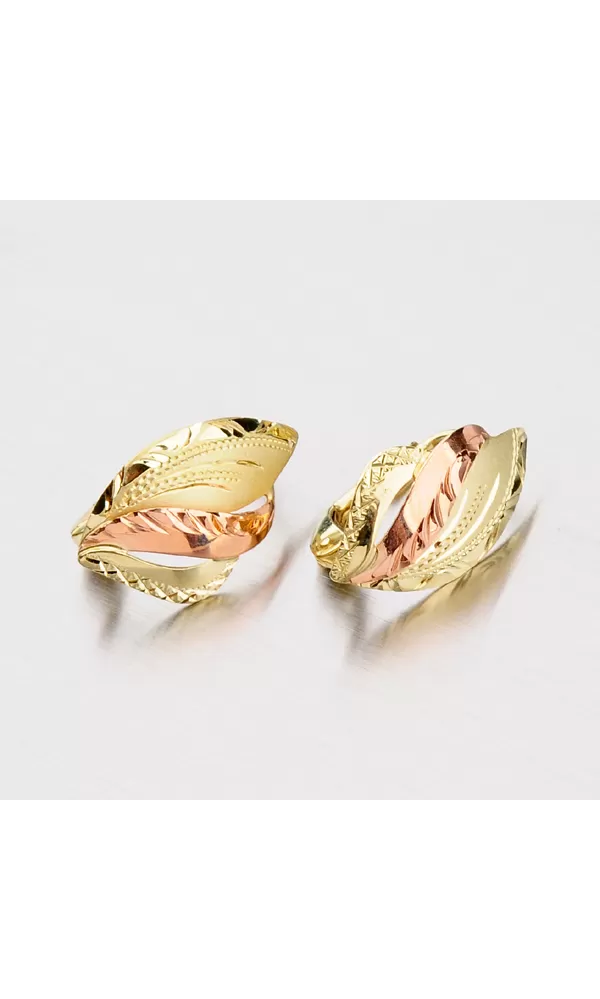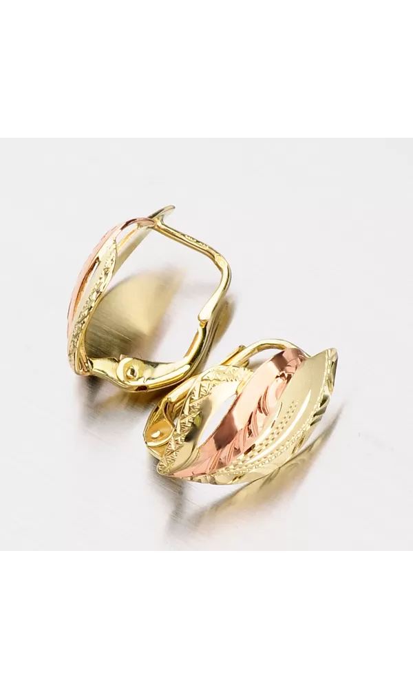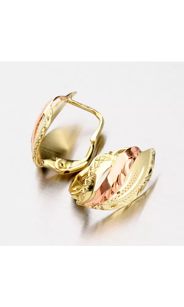 Klasické dámské náušnice jsou vyrobené tradiční klenotnickou technikou v kombinaci žlutého a červeného čtrnáctikarátového zlata 585/1000 v lesklé a matné povrchové úpravě. Náušnice se zapínají na klapky.