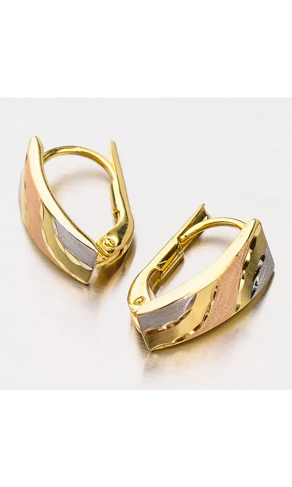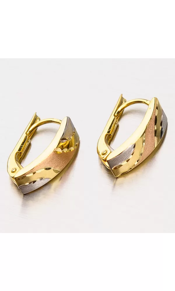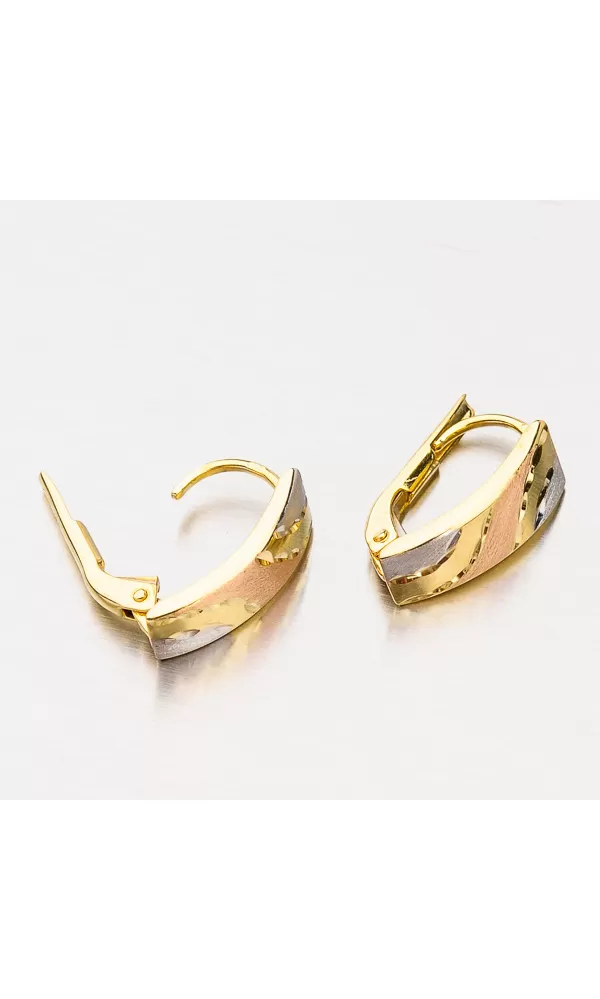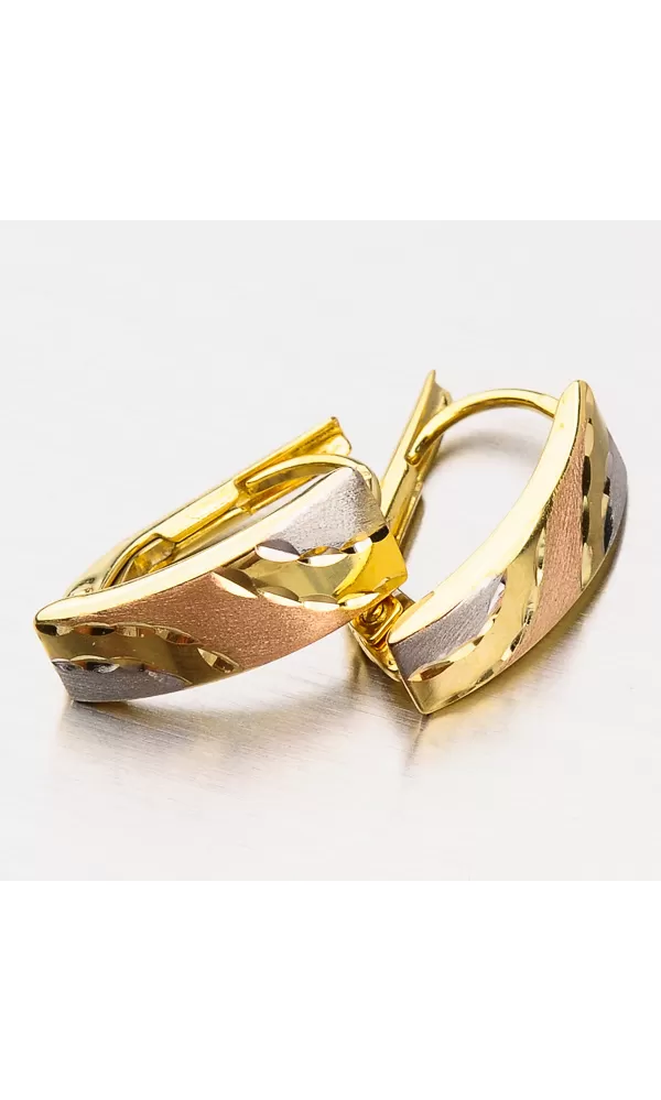 Tento originální design těchto náušnic vás upoutá. Je použita červená, žlutá i bílá barva zlata. Jsou tvořeny barevné vlny, které jsou rozděleny gravírováním. Náušnice jsou v kombinaci matné a lesklé povrchové úpravě aby vynikly barevné kombinace. Výhodou těchto náušnic je váha. Jsou lehoučké a tak je na uchu ani neucítíte. Náušnice se zapínají na klapku.