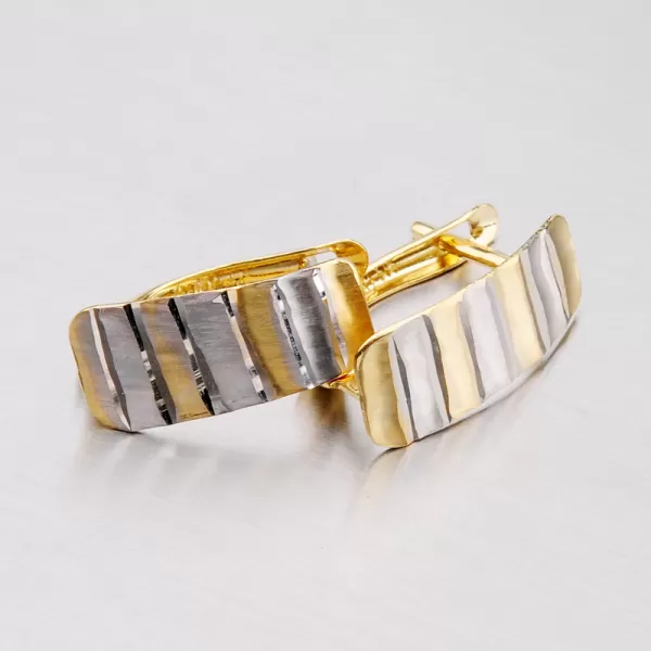 Velmi efektní model vás okouzlí tvarem, který se v horní části rozšiřuje a v dolní části se zužuje. Co vás na první pohled zaujme je zaručeně originální zdobení. Náušnice zdobí bílá barva zlata, která se střídá se zlatými proužky. Velký efekt vytvořilo gravírování. Gravírování je provedeno diamantovým rycím hrotem, který zajišťuje nejvyšší možný lesk gravírovaných facet.