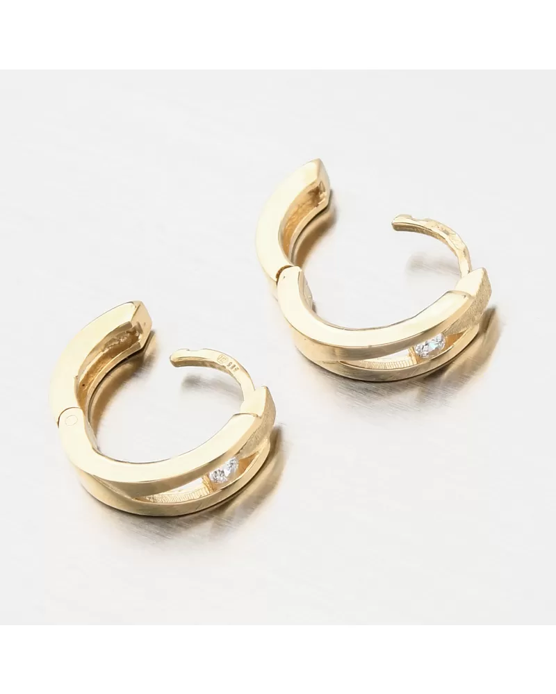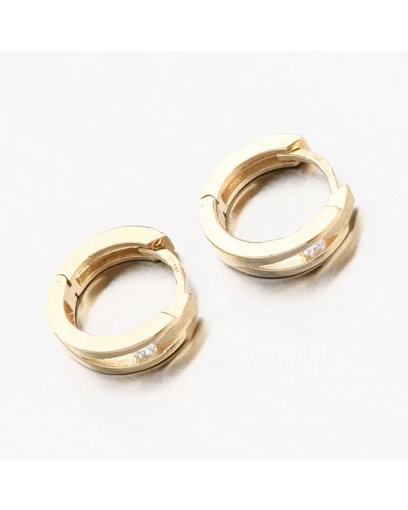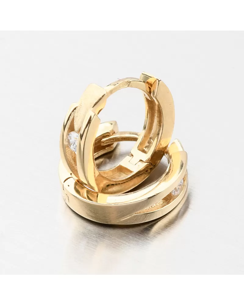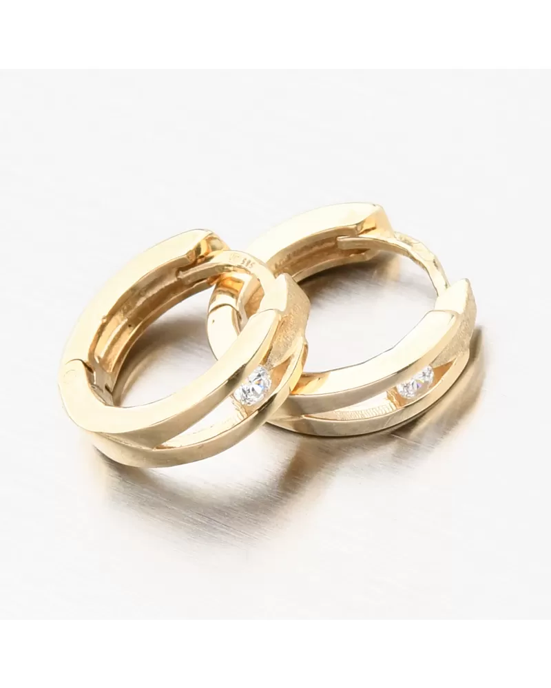 Jemné zlaté náušnice kroužky s pevnou konstrukcí si zamilujete. Kroužky jsou praktické a velmi pohodlné a to je přesně to, co potřebujete. Tento model zdobí přední strana, která má horní část v matu a poté vede dolů náušnice do tvaru písmene V. Ve středu je osazen zářivý zirkon v briliantovém brusu. Tento brus zajišťuje maximální brilanci vybroušených facet, dokonale odráží světlo a neuvěřitelně září z každého úhlu pohledu.