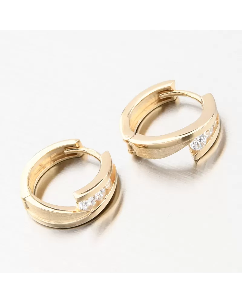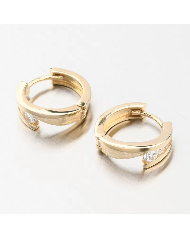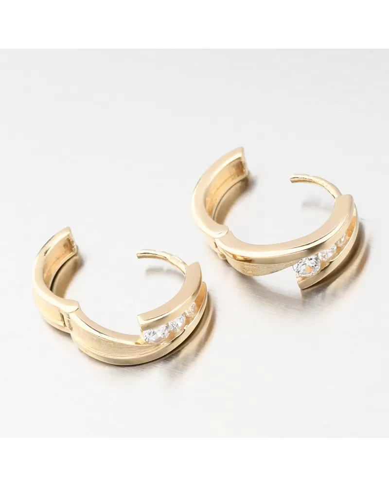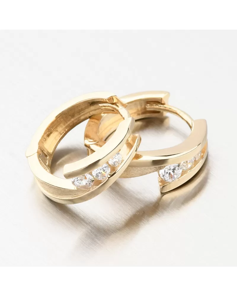 Jemné zlaté náušnice kroužky s pevnou konstrukcí si zamilujete. Kroužky jsou praktické a velmi pohodlné a to je přesně to, co potřebujete. Tento model zdobí přední strana, která se rozděluje na dvě svislé linie a uprostřed jsou tři zářivé zirkony pod sebou v briliantovém brusu. Tento brus zajišťuje maximální brilanci vybroušených facet, dokonale odráží světlo a neuvěřitelně září z každého úhlu pohledu. Spodní část je částečně v matném provedení.