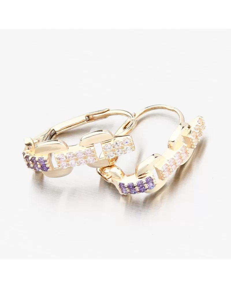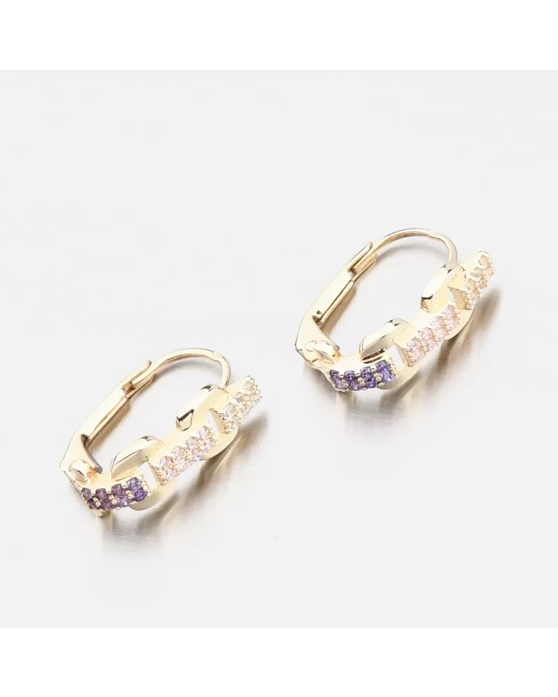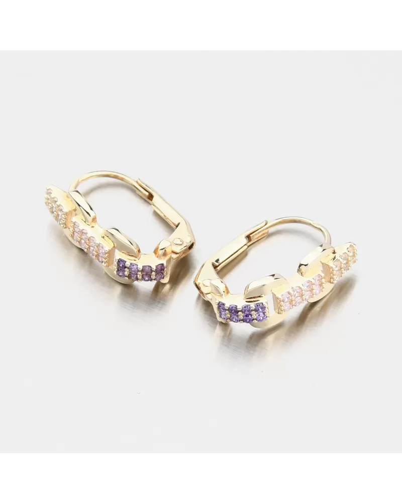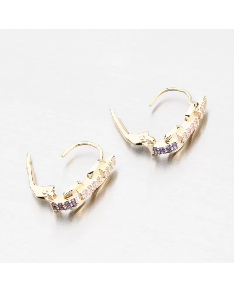 Tyto zlaté náušnice jsou nádherným spojením hravých pastelových odstínů a nadčasové elegance. V linii drobných zirkonů se prolínají bílé, jemné fialové a světle růžové tóny, které dodávají šperku rafinovanou ženskost. Zirkony jsou briliantového brusu, který zajišťuje maximální brilanci vybroušených facet, dokonale odráží světlo a neuvěřitelně září z každého úhlu pohledu. Díky preciznímu zpracování a bezpečnému zapínání působí náušnice luxusně, ale přitom lehce a subtilně - ideální pro každodenní nošení i zvláštní příležitosti.