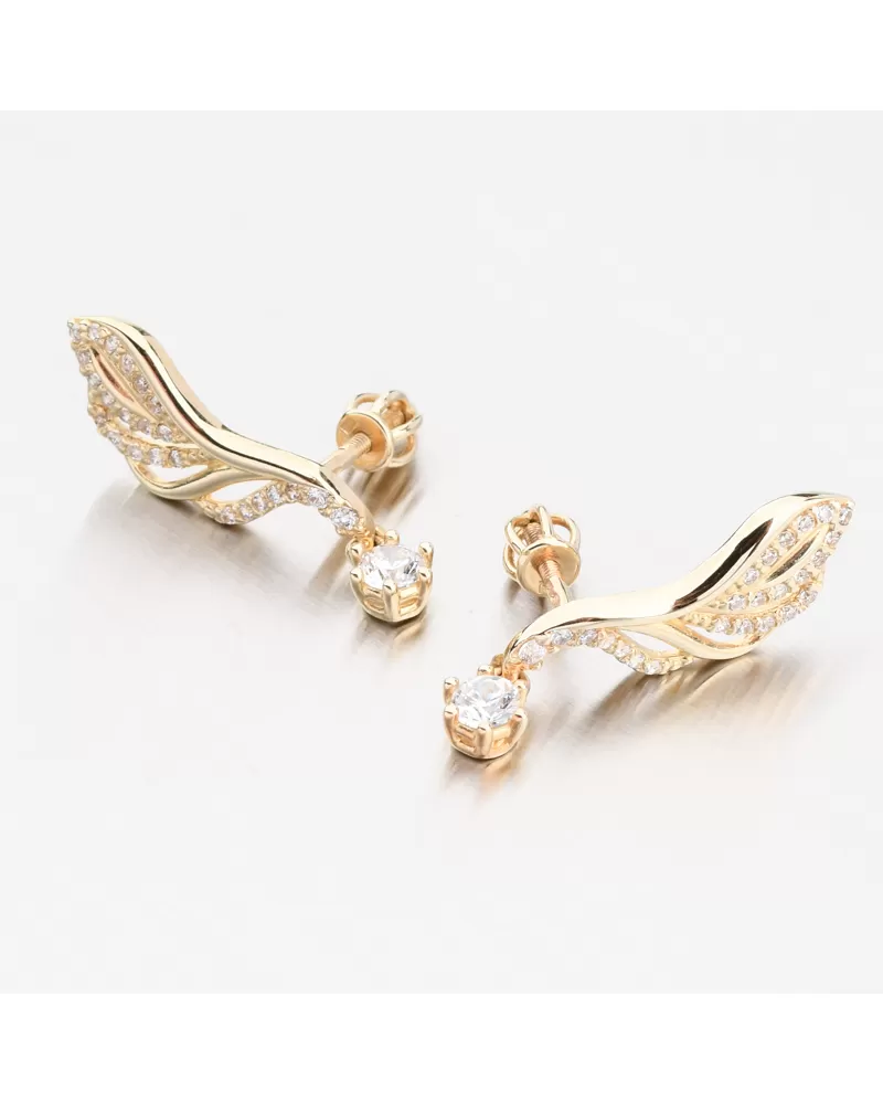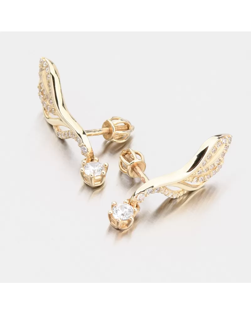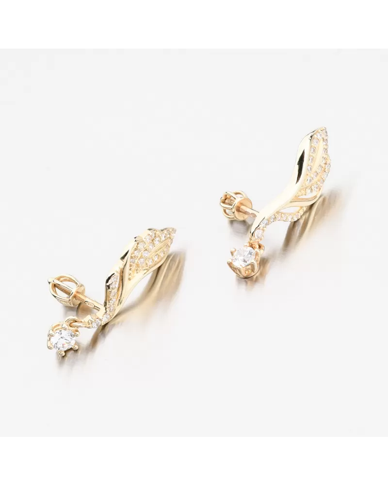 Zlaté náušnice s elegantním lemem a visícím zirkonem. Objevte jemnou eleganci a moderní design v podobě těchto nádherných zlatých náušnic. Jejich tvar je navržen tak, aby lemoval ušní lalůček, čímž vytváří originální a velmi ženský efekt. Horní linie náušnice je zdobena třpytivými zirkony různých veliko, které dodávají šperku luxusní lesk. Pod ušní dírkou pak jemně visí větší čirý zirkon, který přitahuje světlo a krásně rozzáří celou tvář.