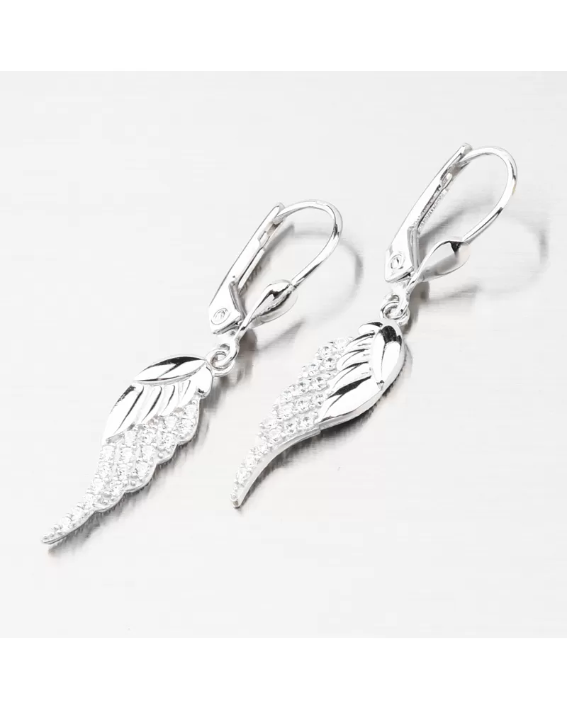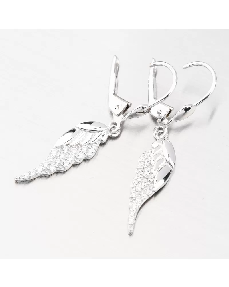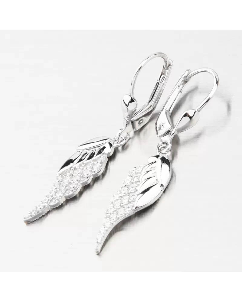 Nádherné visací zlaté náušnice, které zaujmou precizním provedením a kvalitním zpracováním. Náušnice mají visací ozdobu ve tvaru andělského křídla, kde jeho část je osazena zářivými zirkony a zbylá část je ve vysokém lesku. Zirkony jsou briliantového brusu, který propůjčuje zirkonům brilanci pravých diamantů, který podpoří i konstrukce náušnic. Konstrukce je navržena tak aby dokonale prostupovalo světlo kolem zirkonů.
