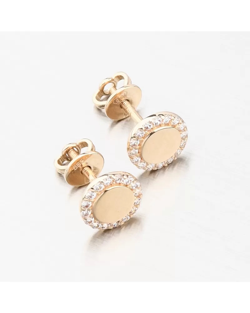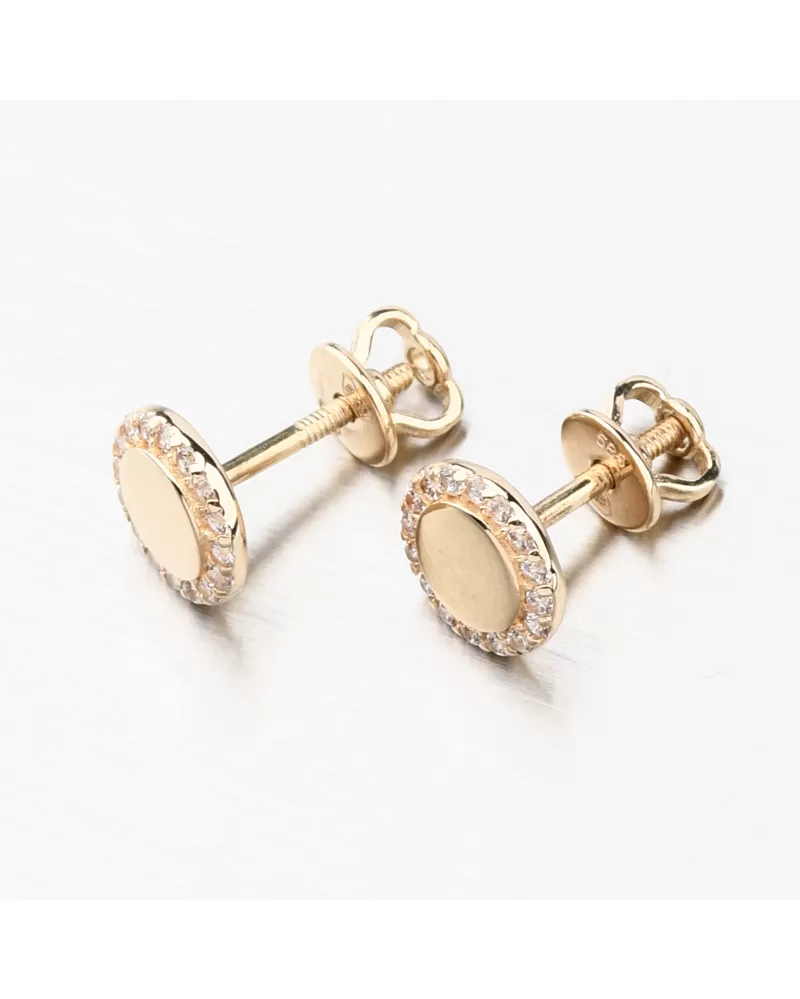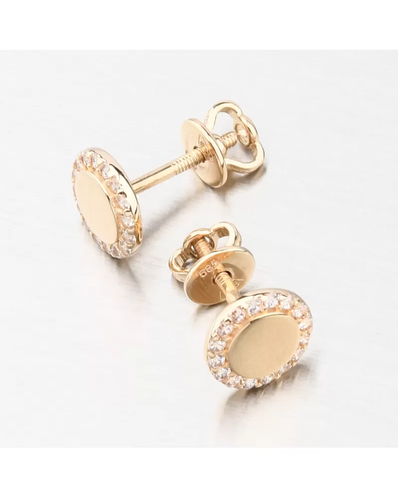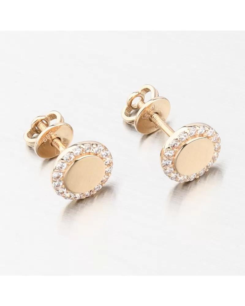 Nádherné zlaté náušnice pecky, které mají po celém obvodu zářivé zirkony. Uprstřed náušnice je pak část ve vysokém lesku. Zirkony je briliantového brusu, který zajišťuje maximální brilanci vybroušených facet, dokonale odráží světlo a neuvěřitelně září z každého úhlu pohledu. Náušnice vypadají krásně a jejich nošení bude pohodlné po celý den.