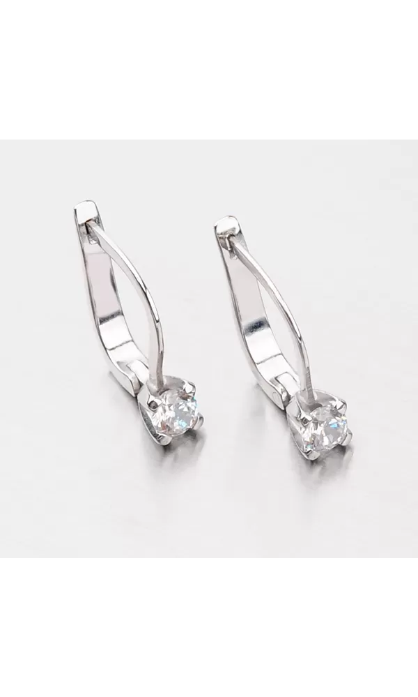 Jednoduché visací náušnice vyrobené z bílého čtrnácti karátového zlata o ryzosti 585/1000 jsou osazeny zářivými zirkony v bílé barvě. Náušnice mají lesklý povrch a zapínají se na pasivní patent. Náušnice zaručeně potěší každou slečnu.