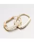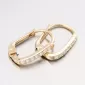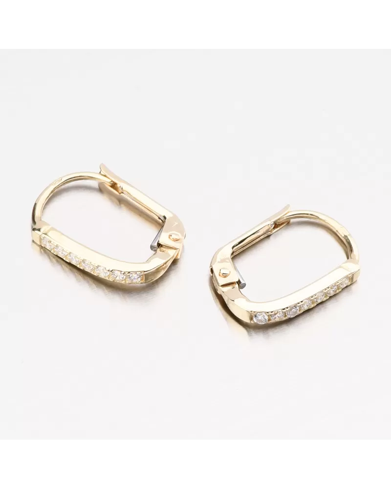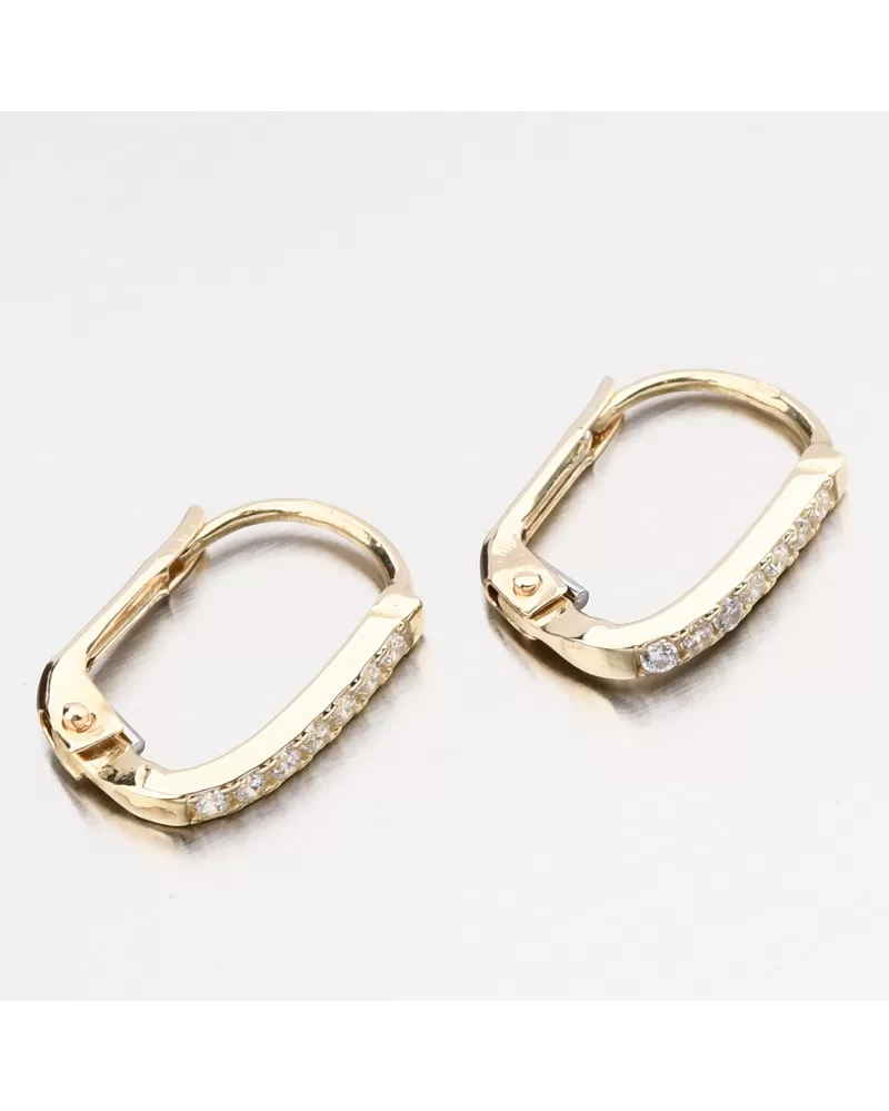 Jemné zlaté náušnice v minimalistickém designu. Ozdoba náušnic je hranatého tvaru a na přední straně osazena bílými zirkony briliantového brusu. Tento brus propůjčuje kamenům brilanci pravých diamantů.