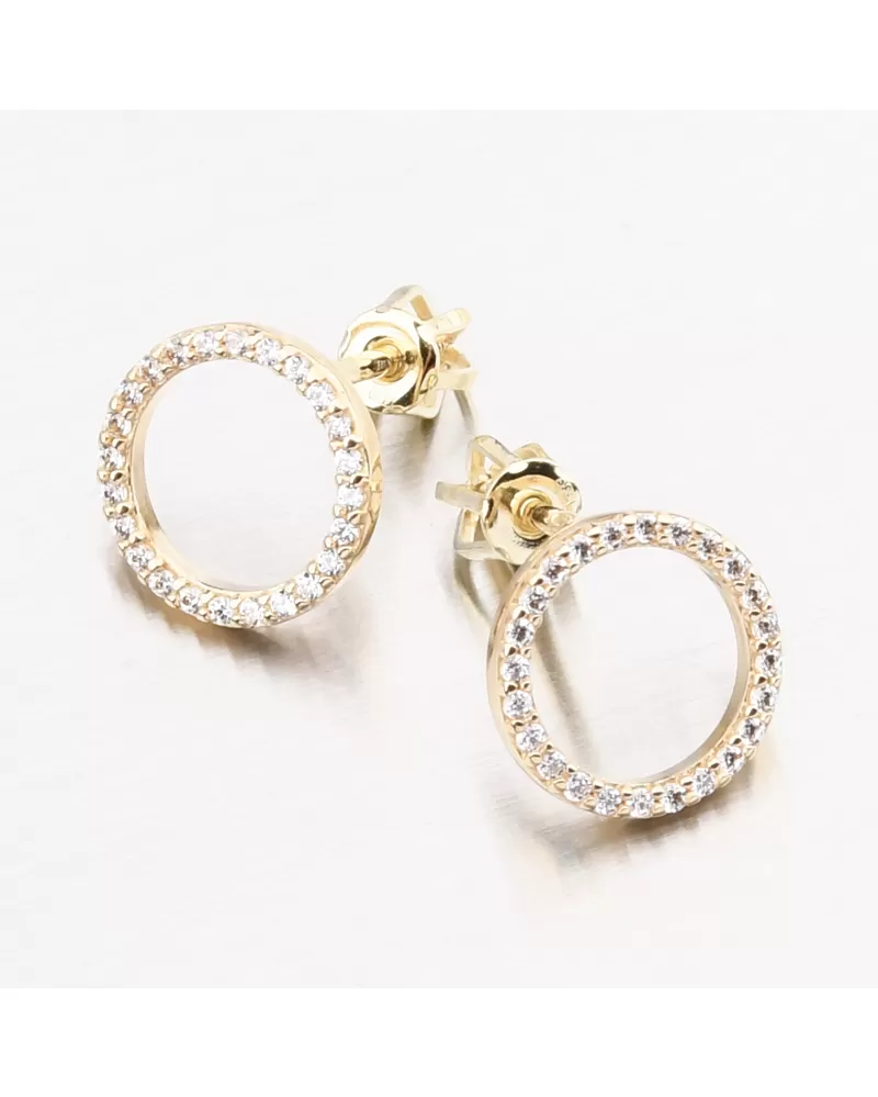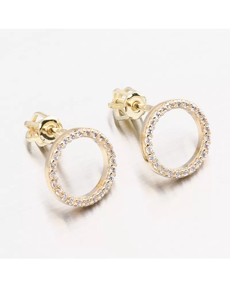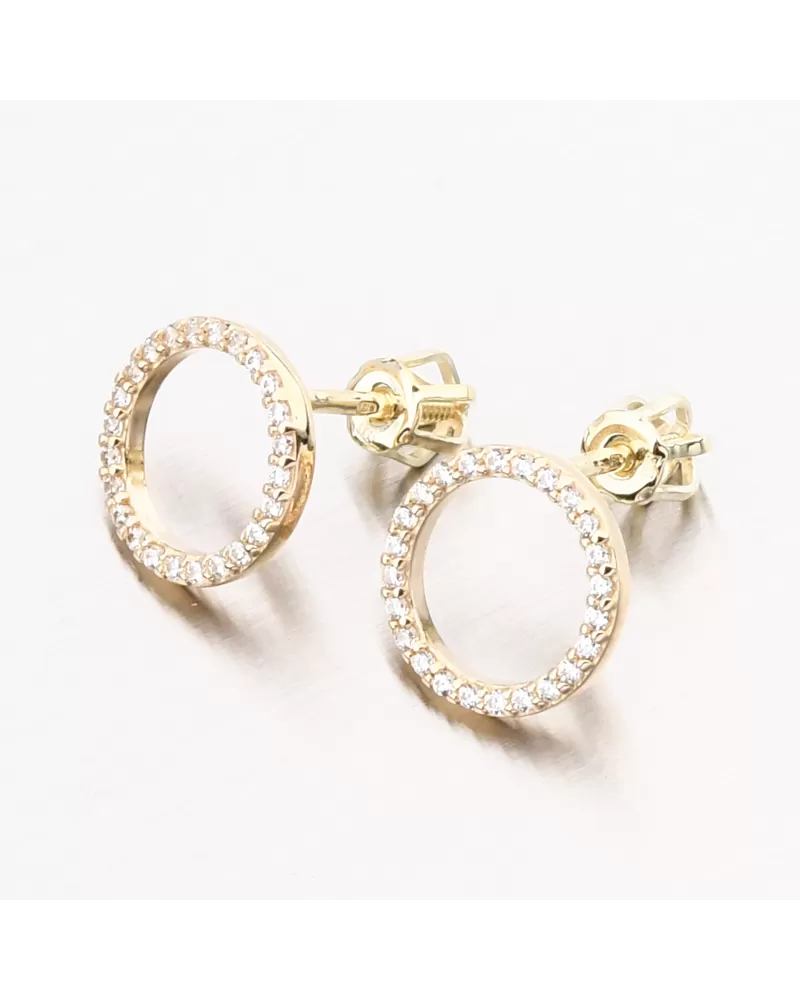 Nadčasové zlaté náušnice s ozdobou ve tvaru kruhu. Kruh o průměru 11 mm je po celém obvodu osazen zářivými zirkony brialiantového brusu. Briliantový brus zajišťuje maximální brilanci vybroušených facet, dokonale odráží světlo a neuvěřitelně září z každého úhlu pohledu.