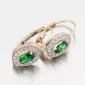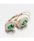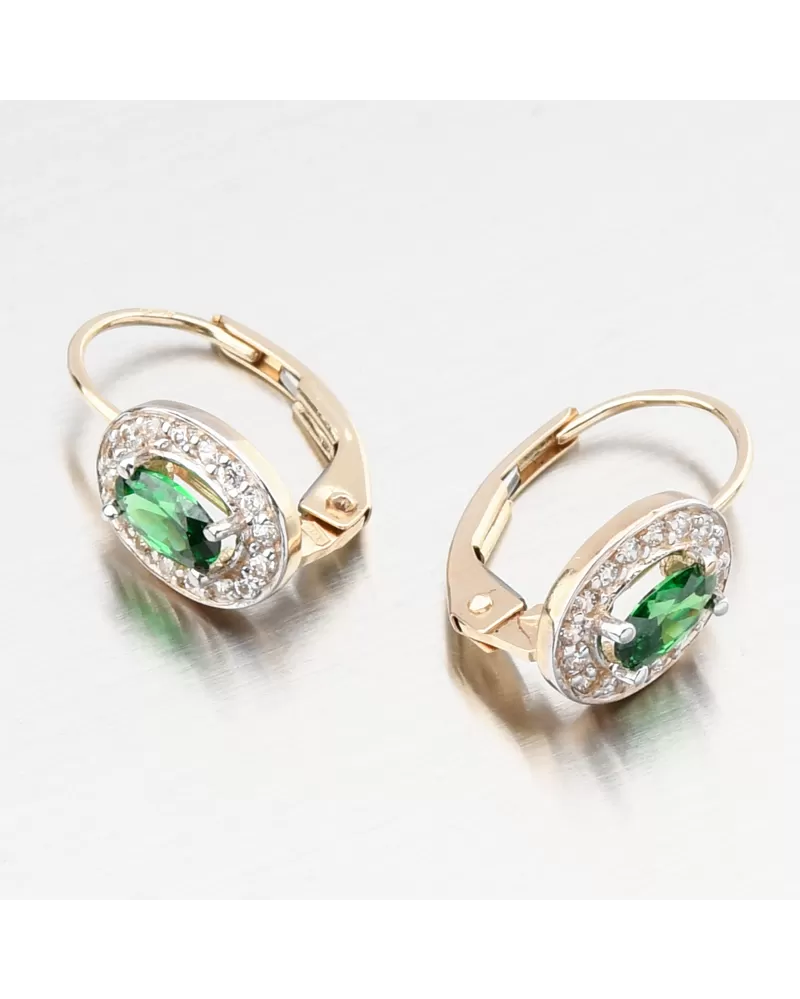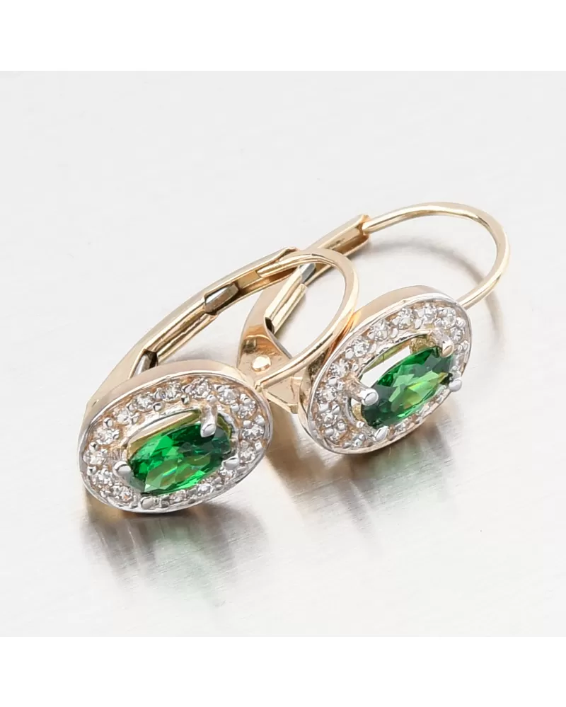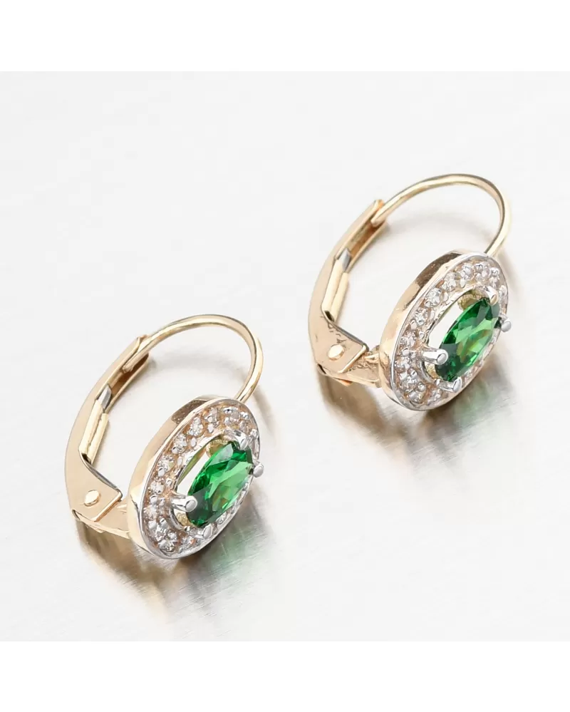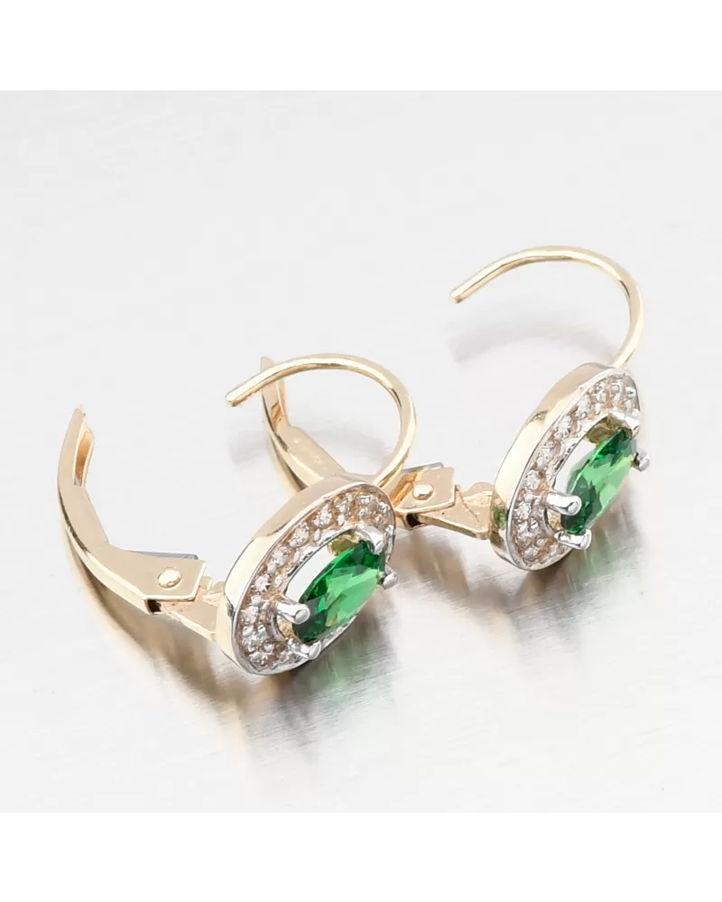 Zlaté náušnice se můžou pyšnit syntetickým smaragdem oválného tvaru upevněný pomocí čtyř krapen. Syntetický smaragd je dominantou tohoto modelu náušnic a dokonale zvýrazní přednosti obličeje a doplní celkový vzhled. Okolo smaragdu jsou vsazeny zirkony briliantového brusu. Tento brus propůjčuje kamenům brilanci pravých diamantů.