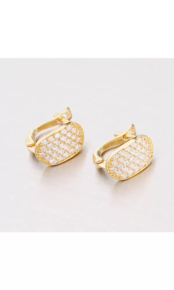Jedinečné dámské náušnice osazené bílými zirkony jsou vyrobené ze žlutého čtrnáctikarátového zlata 585/1000 v lesklé povrchové úpravě. Náušnice mají zapínání na pasivní patent.