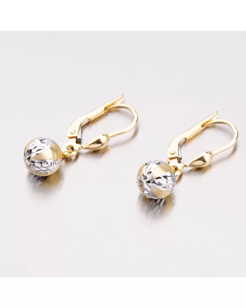 Krásné dámské náušnice rozzáří oči nejedné z vás. Náušnice jsou zdobeny přívěskem ve tvaru kuličky, která je zdobena bílou barvou zlata. Části z bílého zlata jsou zvýrazněny gravírováním. Gravírování je provedeno diamantovým rycím hrotem, který zajišťuje nejvyšší možný lesk gravírovaných facet. Kulička je také zdobena matnou povrchovou úpravou a díky této úpravě gravírování skvěle vynikne.