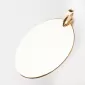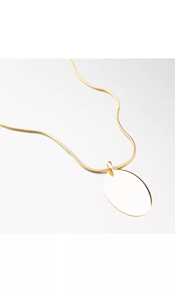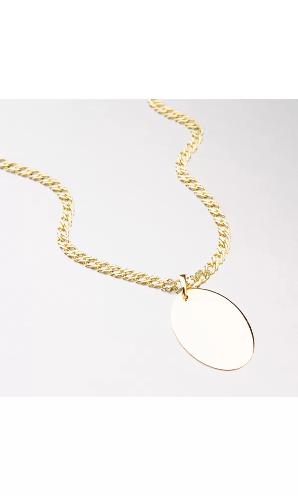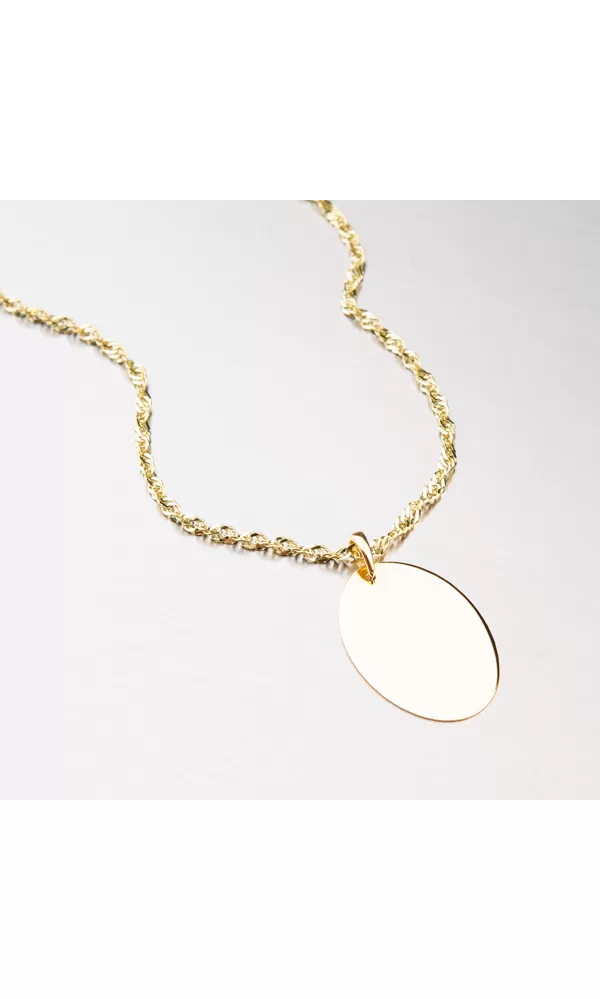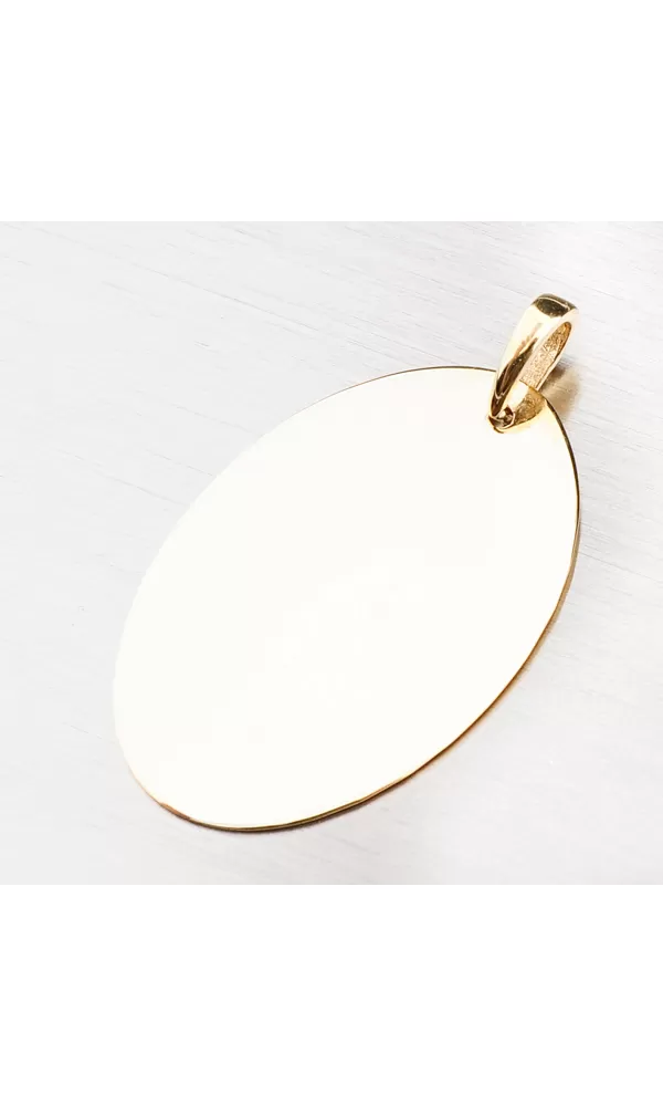 Moderní přívěsek ve tvaru destičky je vyroben ze žlutého čtrnáctikarátového zlata 585/1000 v lesklé povrchové úpravě. Destička je v oválném tvaru. Na zadní nebo přední stranu přívěsku je možno vyrýt vámi vybraný text jako je např. jméno nebo písmeno. Popis rytiny prosím uveďte v kolonce speciální požadavky.