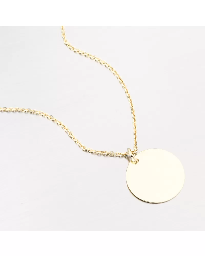 Jednoduchý zlatý přívěsek kulatého tvaru ve vysokém lesku. Na přívěsek je možné nechat z přední nebo zadní strany udělat rytinu. Např. jméno, datum,… Celý popis