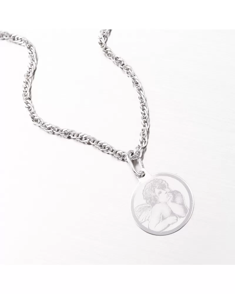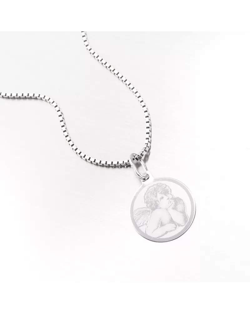 Přívěsek je vyroben z bílého čtrnáctikarátového zlata 585/1000. Zlatý přívěsek se může pyšnit na přední straně roztomilým andílkem, který zvýrazňuje matná povrchová úprava. Zlatým přívěskem potěšíte muže i ženu. Na přívěsek je možné nechat na zadní stranu udělat rytinu. Např. jméno, datum, věnování. Přívěsek s rytinou se hodí jako perfektní dárek pro Vaše milované. Detaily prosím uveďte do kolonky "rytina".