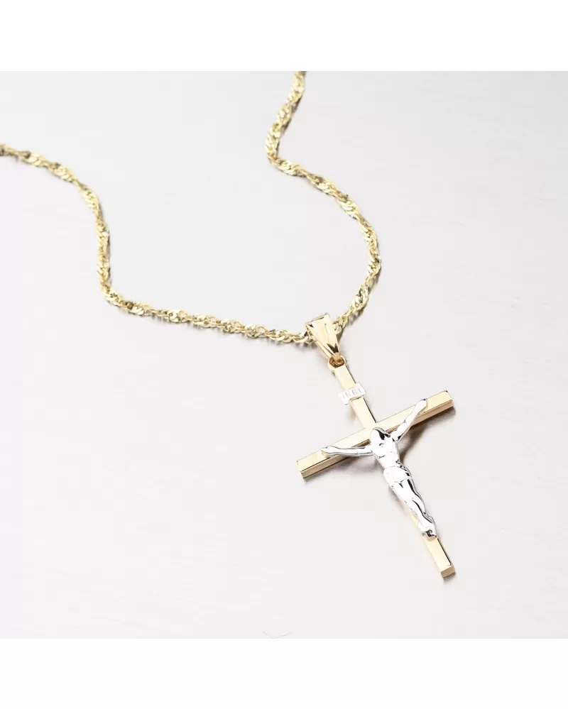 Velký kříž vás zaujme propracovaným Ježíšem v bílé barvě zlata. Zadní strana přívěsku je hladká a díky tomu přívěsek dokonale přilne k dekoltu. Přívěsek je vyrobený ze žlutého čtrnáctikarátového zlata 585/1000 v lesklé povrchové úpravě. Přívěsek potěší ženy i muže.