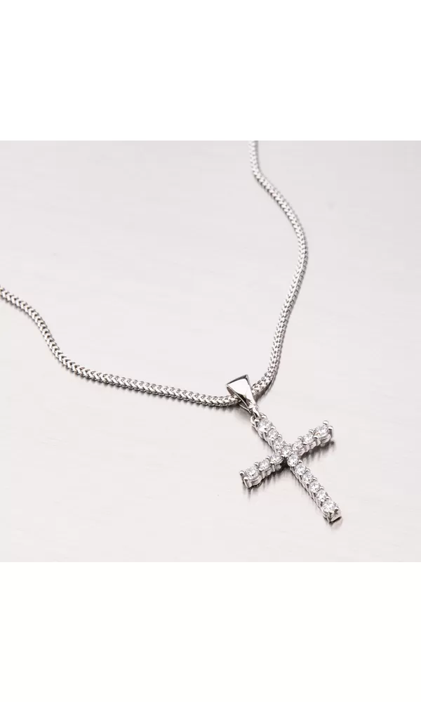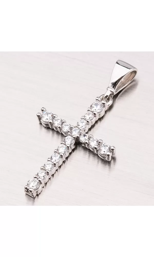 Jemný přívěsek ve tvaru kříže se bude krásně vyjímat ve vašem dekoltu. Krásný přívěsek je vyrobený z bílého zlata o ryzosti 585/1000 v lesklé povrchové úpravě. Přívěsek je celý osázený třpytivými zirkony v briliantovém brusu. K tomuto přívěsku je vhodný řetízek o šířce 1,50 mm.