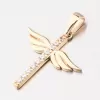 Decentní přívěsek ve tvaru kříže zaujmou andělskými křídly a zirkony, které jsou precizně vsazeny jeden vedle druhého. Zirkony jsou briliantového brusu, zajišťuje maximální brilanci vybroušených facet, dokonale odráží světlo a neuvěřitelně září z každého úhlu pohledu. Zadní strana přívěsku je hladká a díky tomu přívěsek dokonale přilne k dekoltu. Přívěsek je vyrobený ze žlutého čtrnáctikarátového zlata 585/1000 v lesklé povrchové úpravě. Přívěsek potěší ženy i muže.