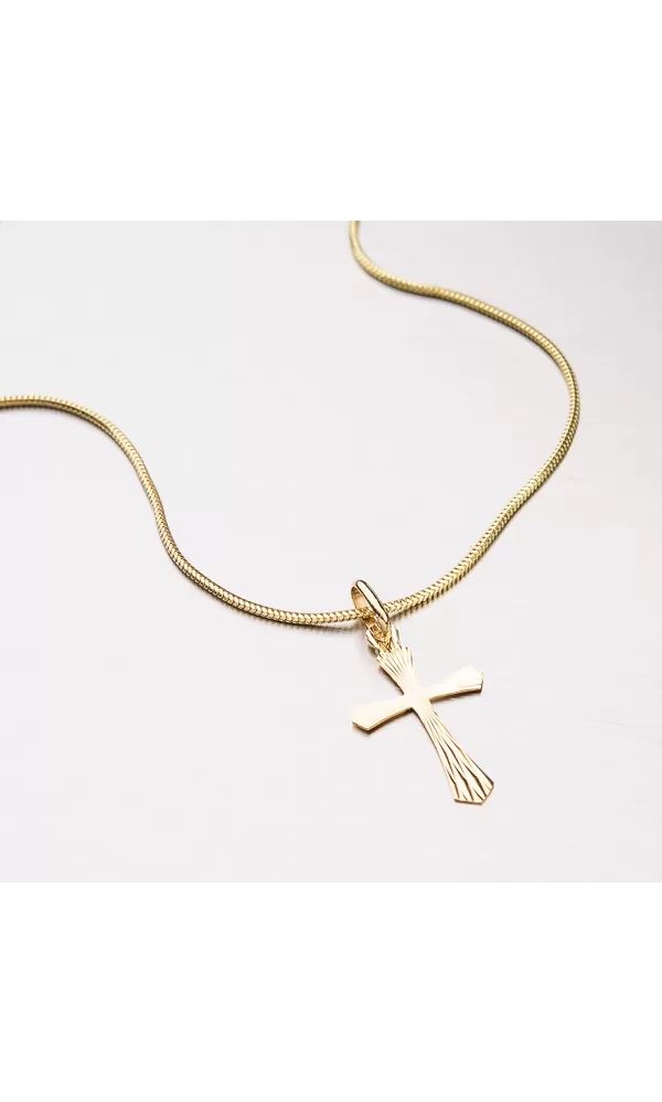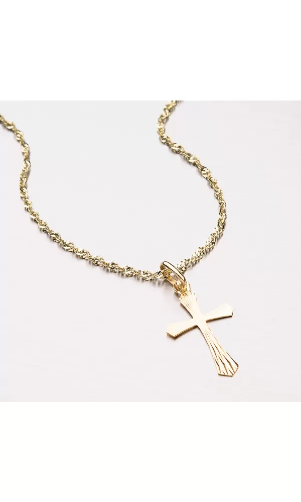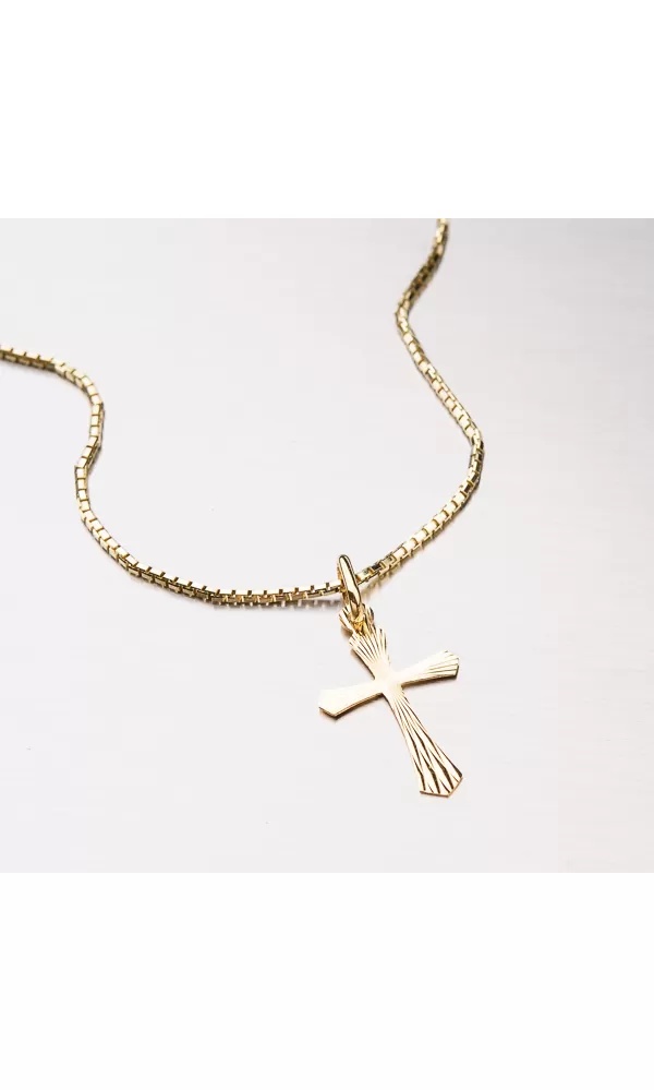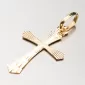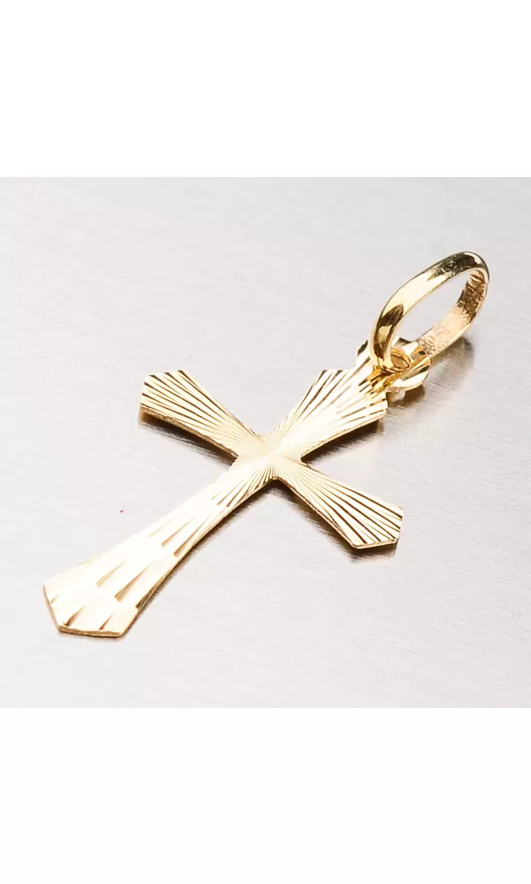 Přívěsek ve tvaru kříže ze žlutého čtrnáctikarátového zlata 585/000 v lesklé povrchové úpravě s gravírováním.