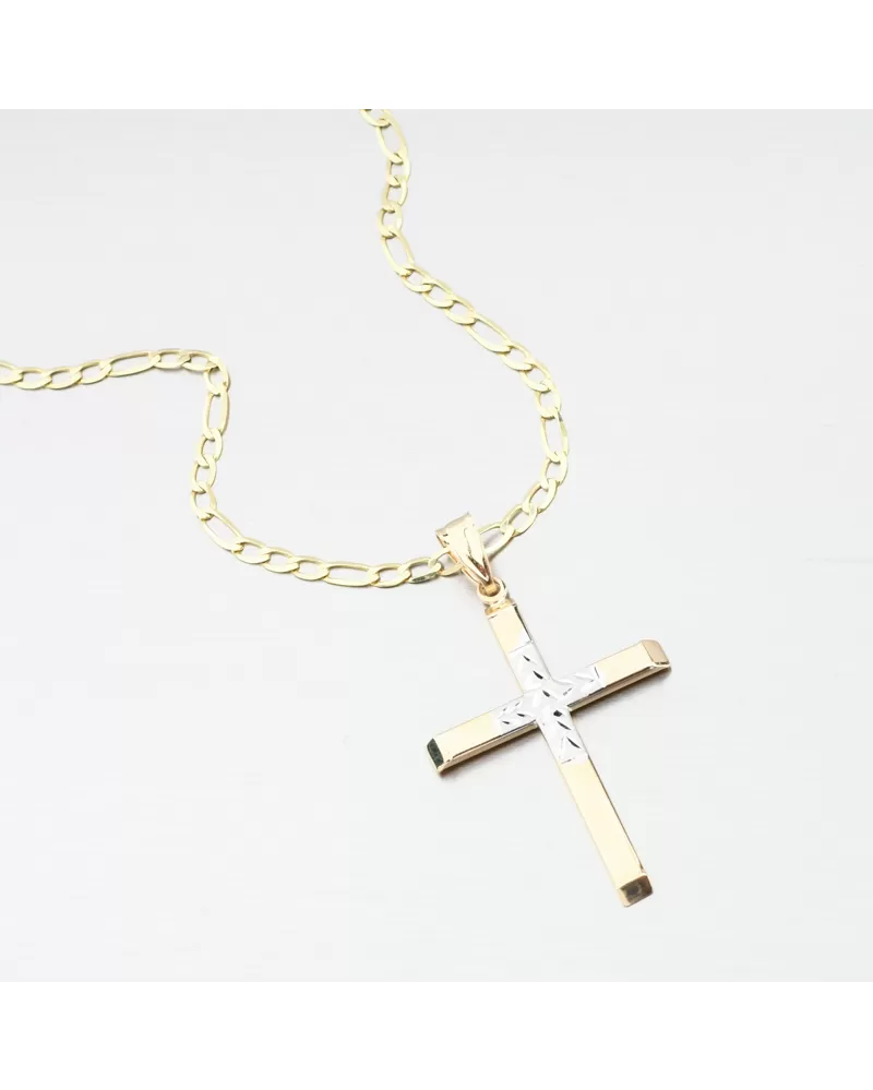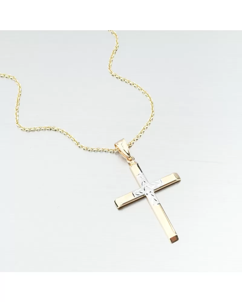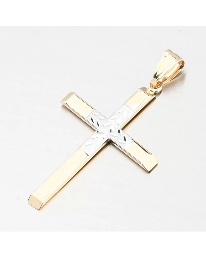 Tento zlatý přívěsek ve tvaru kříže spojuje klasickou symboliku víry s moderním designem, který zaujme svou jemností i leskem. Střed kříže je v bílé barvě zlata v matné povrchové úpravě, zvýrazněný precizním gravírováním. Jedná se o dutý přívěsek, který je výhodný pro svou lehkost a vizuální větší objem za nižší cenu než masivní šperk. Dutý přívěsek se pohodlněji nosí, zejména pokud je většího objemu. Duté šperky vyžadují opatrnější zacházení a obezřetnost při nošení, aby nedošlo k jejich deformaci.