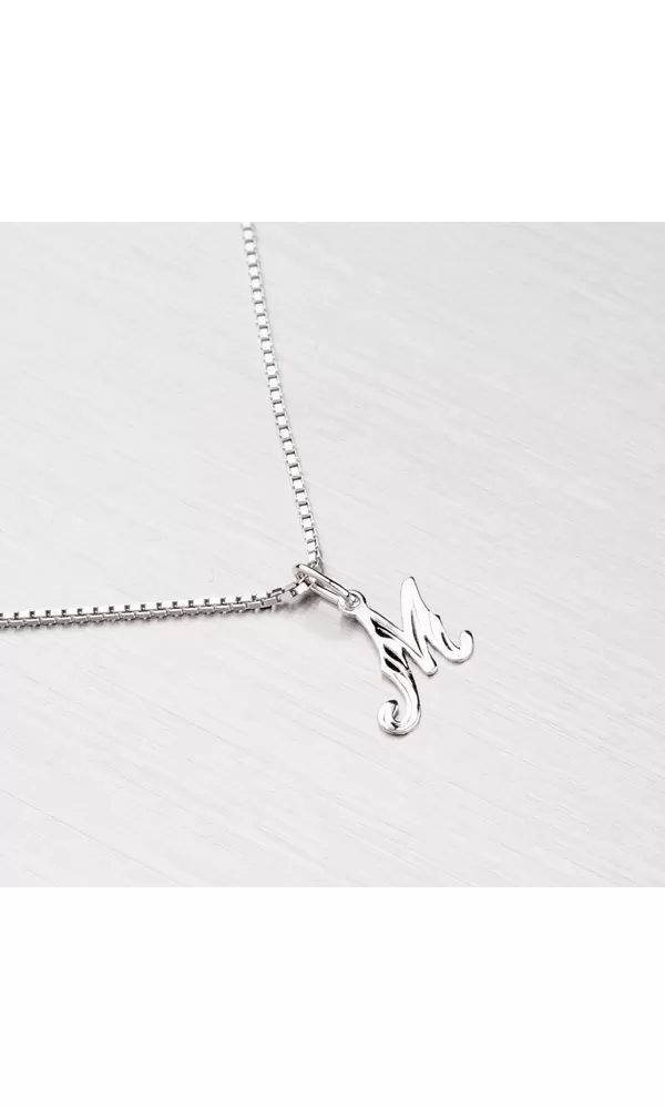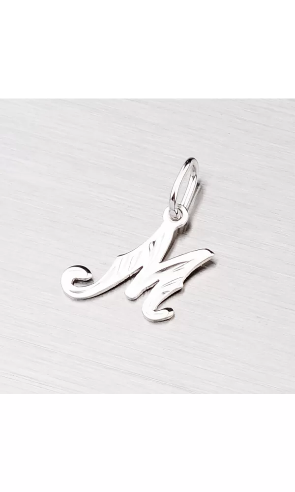 Jemný přívěsek ve tvaru písmenka M z bílého čtrnáctikarátového zlata ryzosti 585/1000 v lesklé povrchové úpravě. K přívěsku je vhodné použít řetízek o průměru 1,50 mm. Písmenko je zdobeno ručním gravírováním.