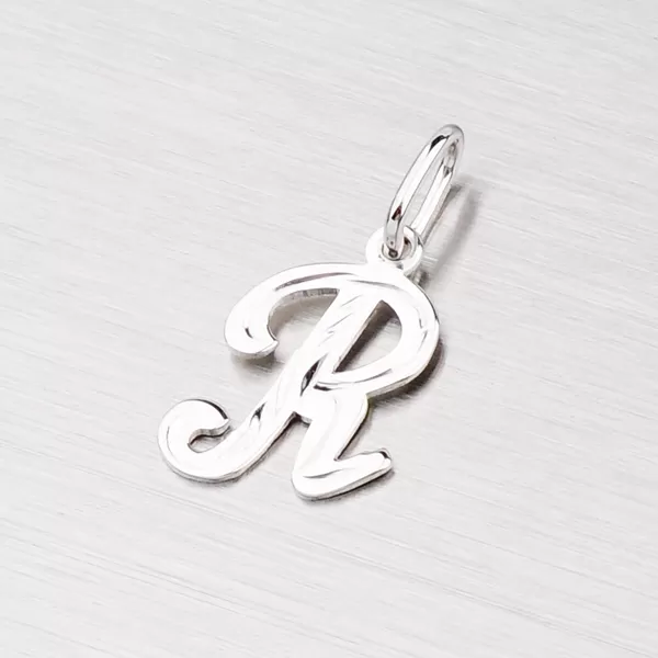 Jemný přívěsek ve tvaru písmenka R z bílého čtrnáctikarátového zlata ryzosti 585/1000 v lesklé povrchové úpravě. K přívěsku je vhodné použít řetízek o průměru 1,50 mm. Písmenko je zdobeno ručním gravírováním.
