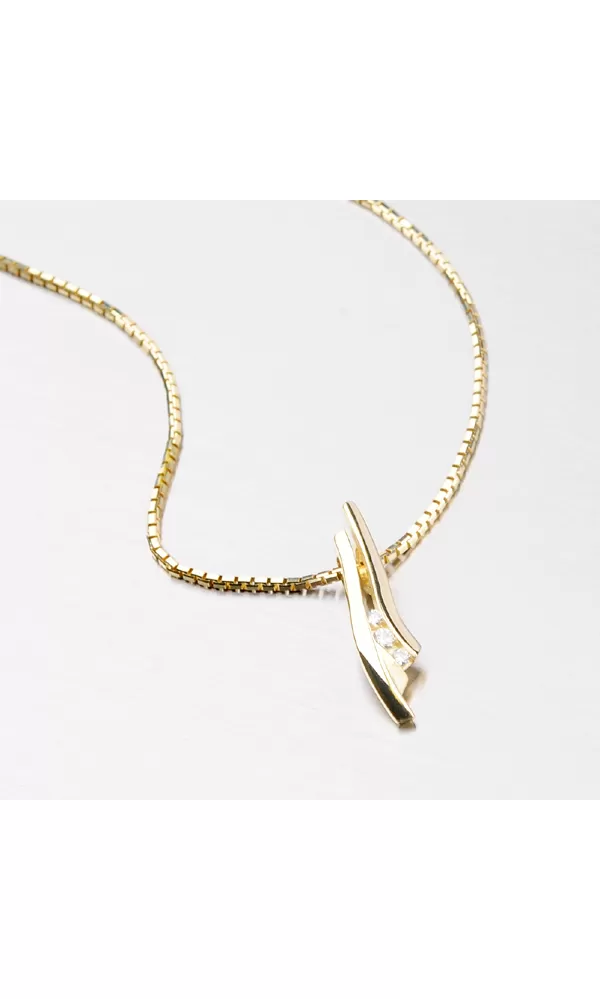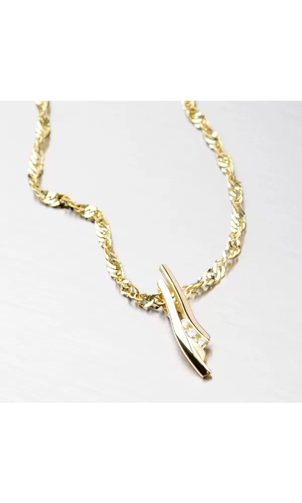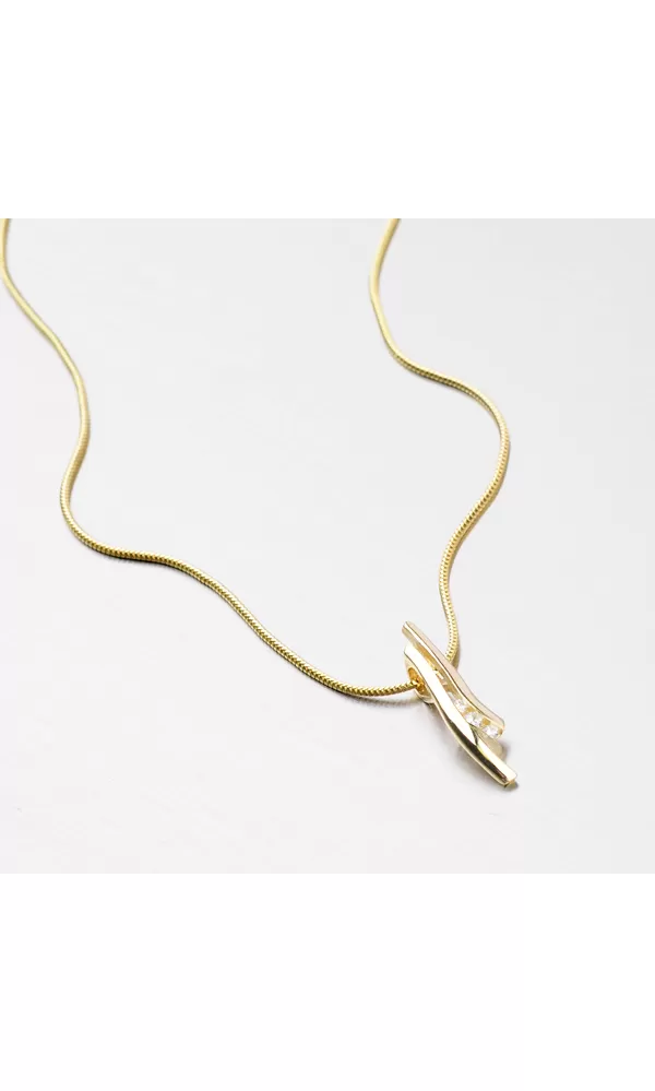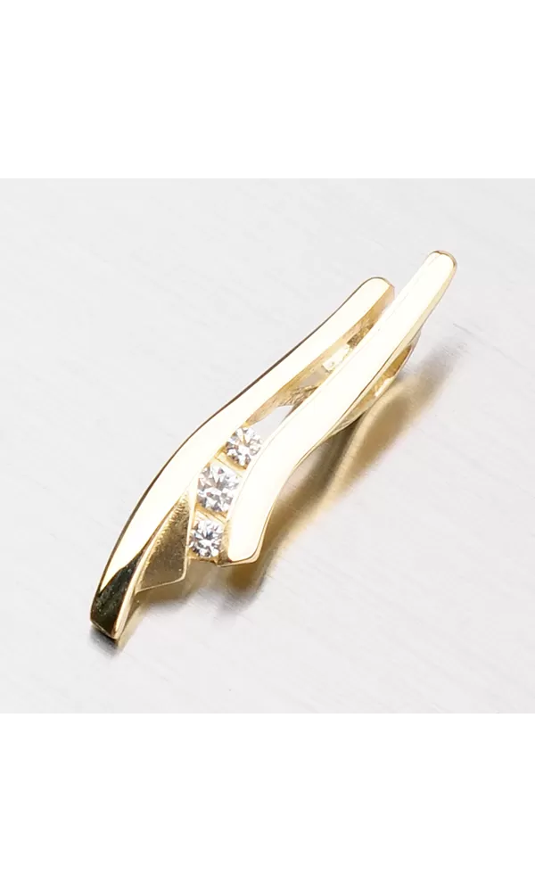 Přívěsek se třemi bílými zirkony ze žlutého čtrnácti karátového zlata 585/000 v lesklé povrchové úpravě. Přívěsek je elegantním a moderním kouskem módy, který nebudete chtít sundat.