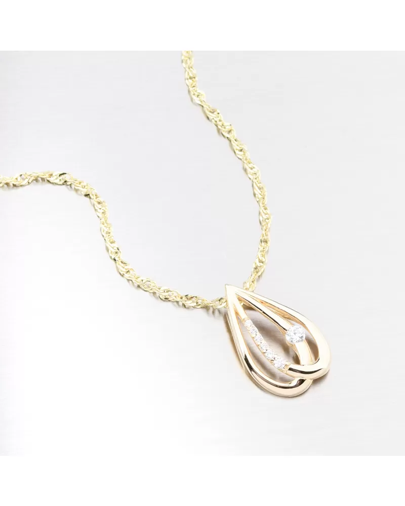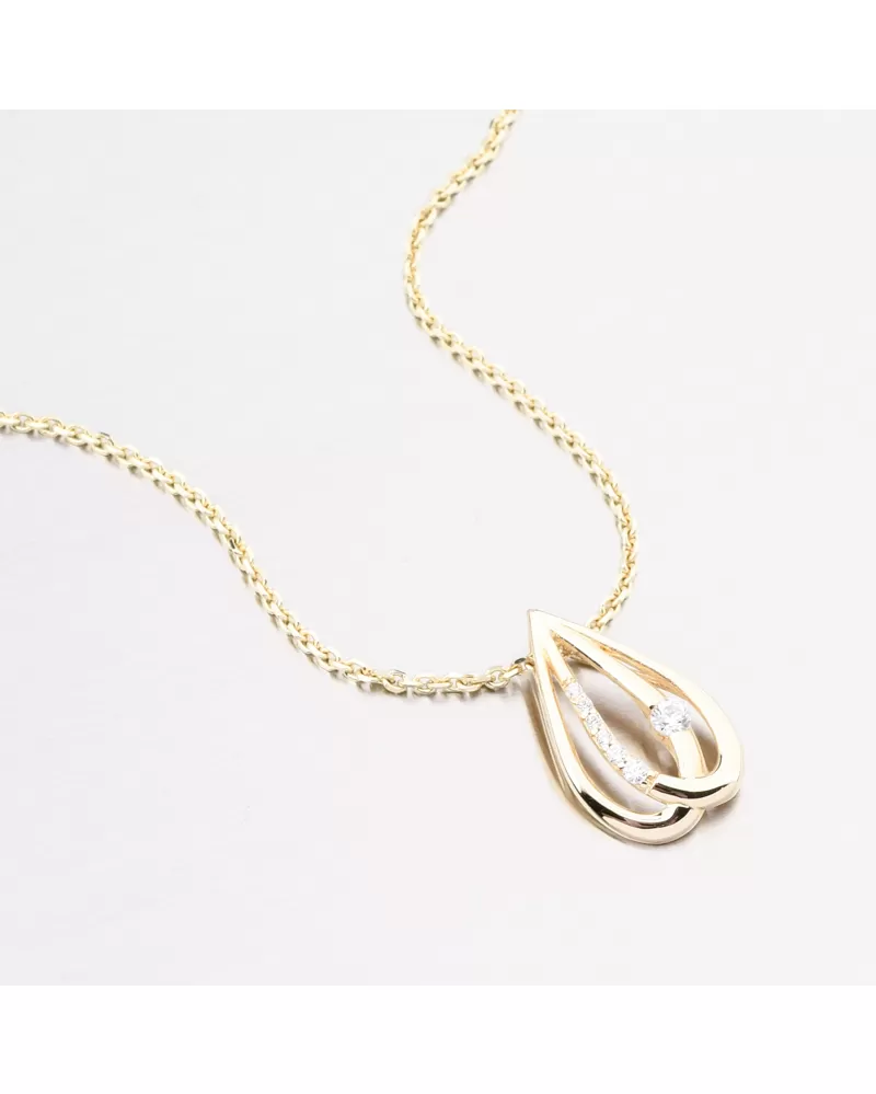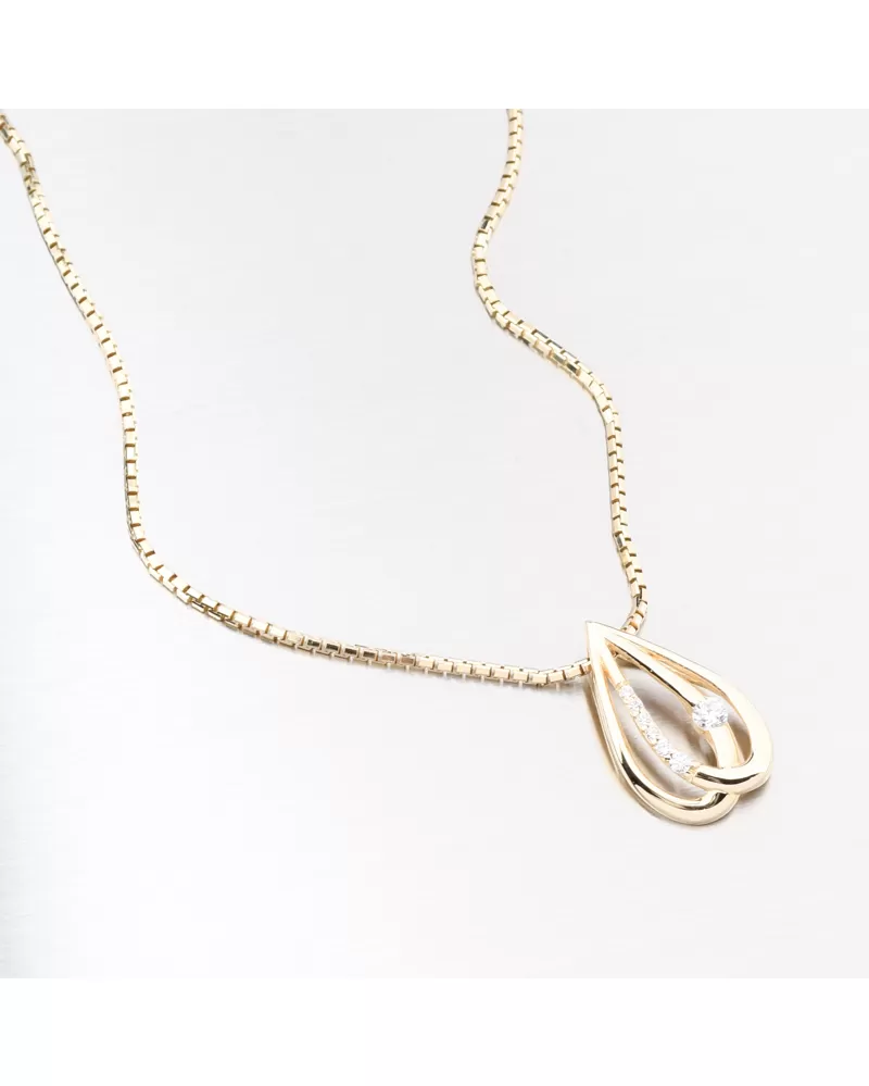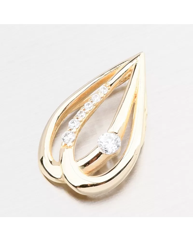 Luxusní přívěsek z kvalitního zlata v nadčasovém tvaru kapky působí jemně a přitom velmi elegantně. Uvnitř je osazen jedním větším zirkonem, který krásně vyniká v kontrastu s několika menšími zirkony. Společně vytvářejí hru světel a odrazů, díky které šperk přitahuje pozornost na první pohled. Zirkony jsou briliantového brusu. Tento brus zajišťuje maximální brilanci vybroušených facet. Přívěsek má moderní provedení. Místo klasického očka se řetízek provléká nenápadně zadní částí. Díky tomu působí design čistě, elegantně a šperk na krku dokonale vyniká. Tento přívěsek je ideální volba pro ženy, které milují jemné, ale výrazné šperky. Perfektní jako dárek k významné příležitosti, nebo jako nadčasový kousek pro každý den.