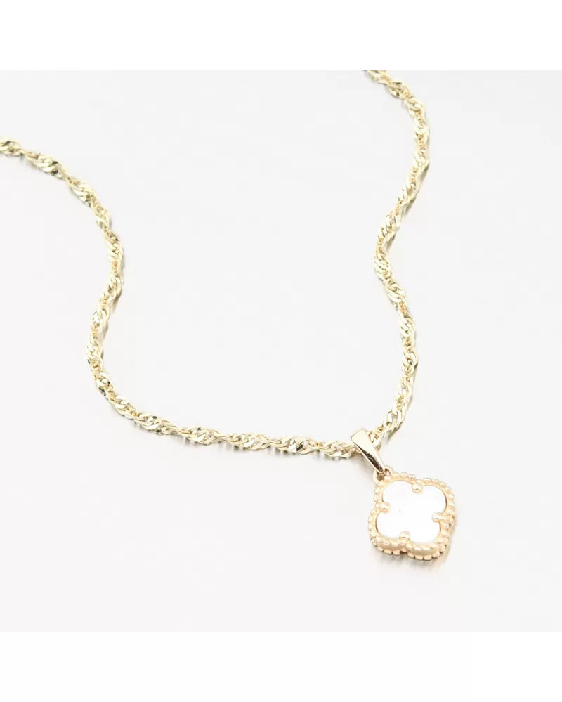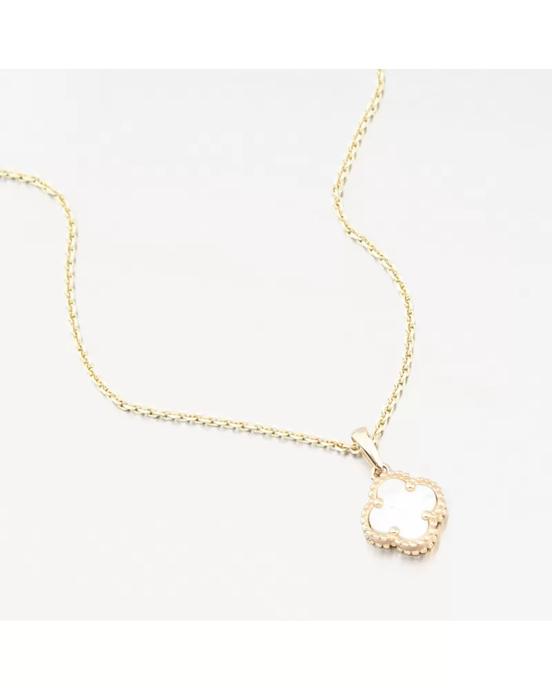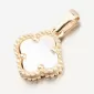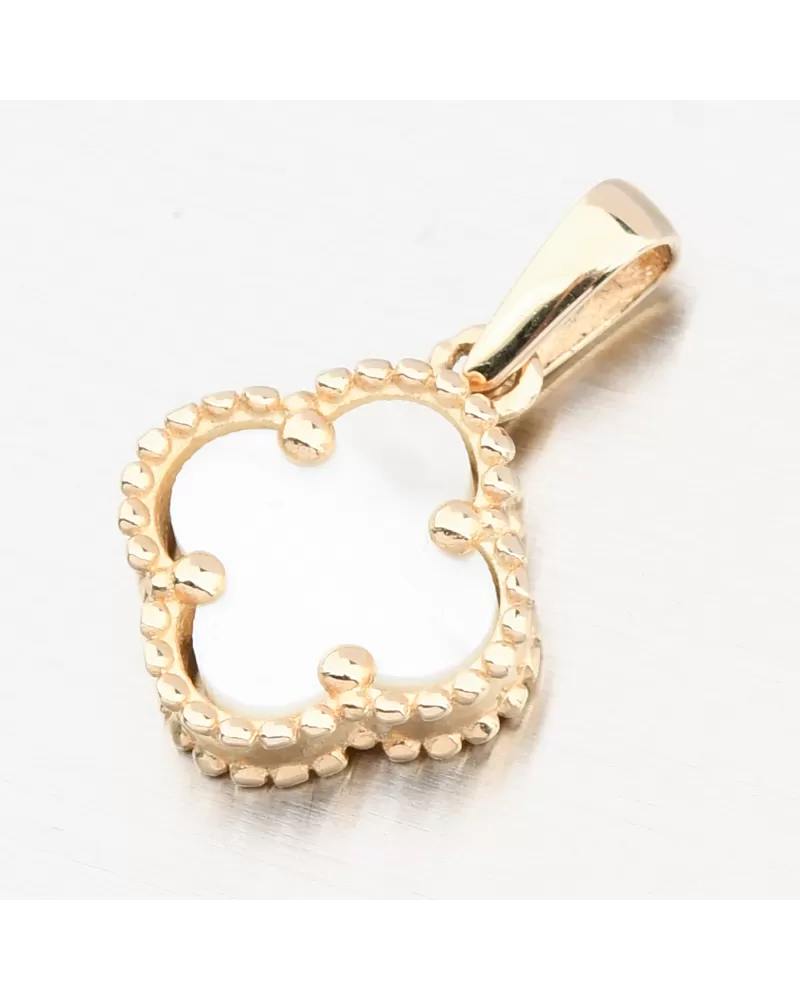 Nadčasová elegance a jemný lesk perleti se spojují v tomto nádherném zlatém přívěsku ve tvaru čtyřlístku. Přívěsek je osazen bílou perletí, která svým přirozeným duhovým odleskem podtrhuje ženskost a půvab nositelky. Jemné korálkové lemování kolem perleti podtrhuje jeho luxusní vzhled a ruční zpracování zaručuje preciznost každého detailu.