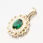 Tento nádherný zlatý přívěsek s oválným smaragdem působí elegantně a sofistikovaně. Dominantní syntetický smaragd je precizně zasazen do středu zlatého rámu a lemován zářícím kruhem bílých zirkonů, které podtrhují jeho sytou barvu a dodávají šperku královský vzhled. Jemné detaily v provedení ze žlutého zlata zvýrazňují celkový luxusní dojem. Bílé zirkony jsou briliantového brusu, který zajišťuje maximální brilanci vybroušených facet, dokonale odráží světlo a neuvěřitelně září z každého úhlu pohledu.