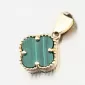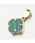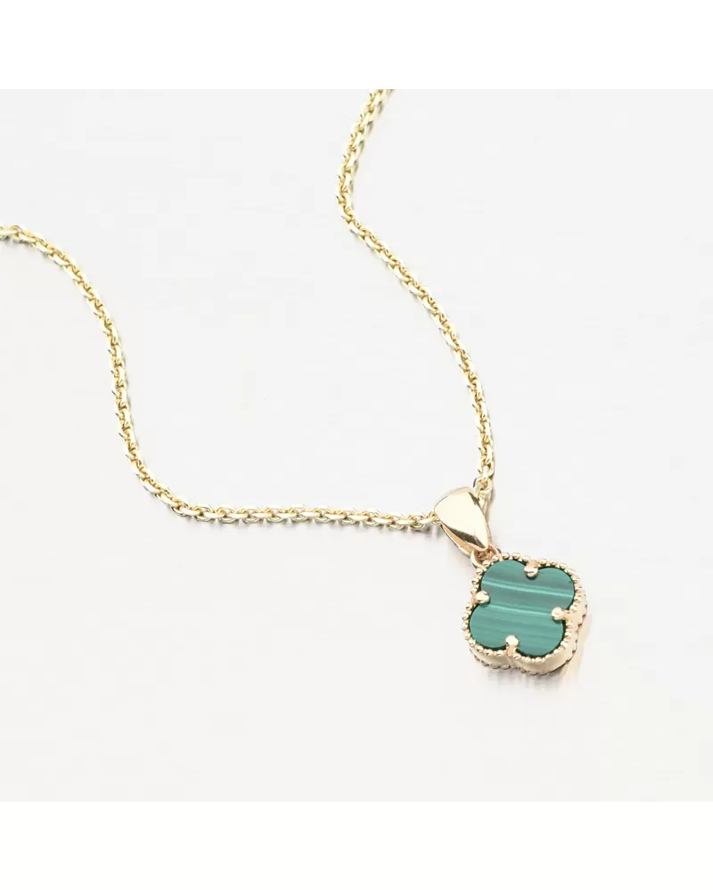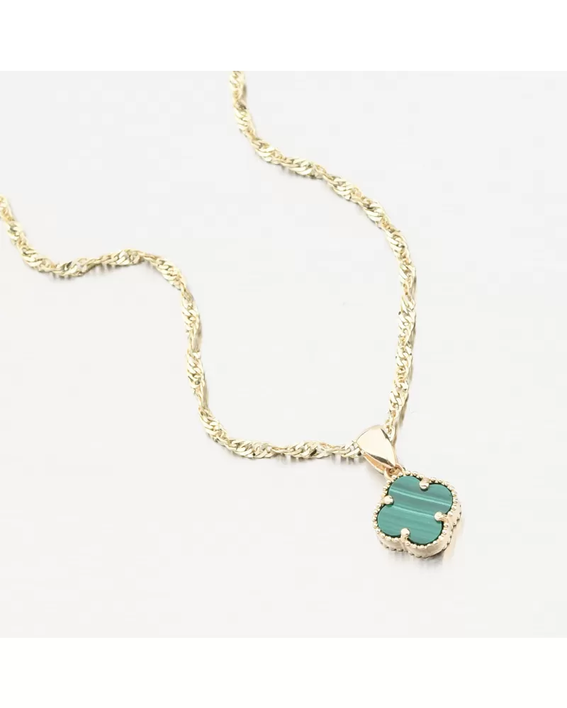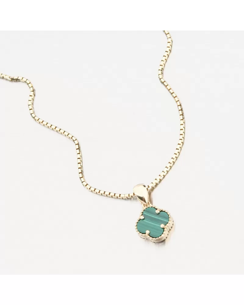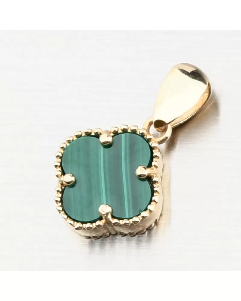 Tento elegantní zlatý přívěsek ve tvaru čtyřlístku je symbolem štěstí a harmonie. Je osazen nádherným syntetickým malachitem – kamenem s typickou zelenou kresbou, která dodává šperku jedinečný charakter. Jemné korálkové lemování kolem kamene podtrhuje jeho luxusní vzhled a ruční zpracování zaručuje preciznost každého detailu.