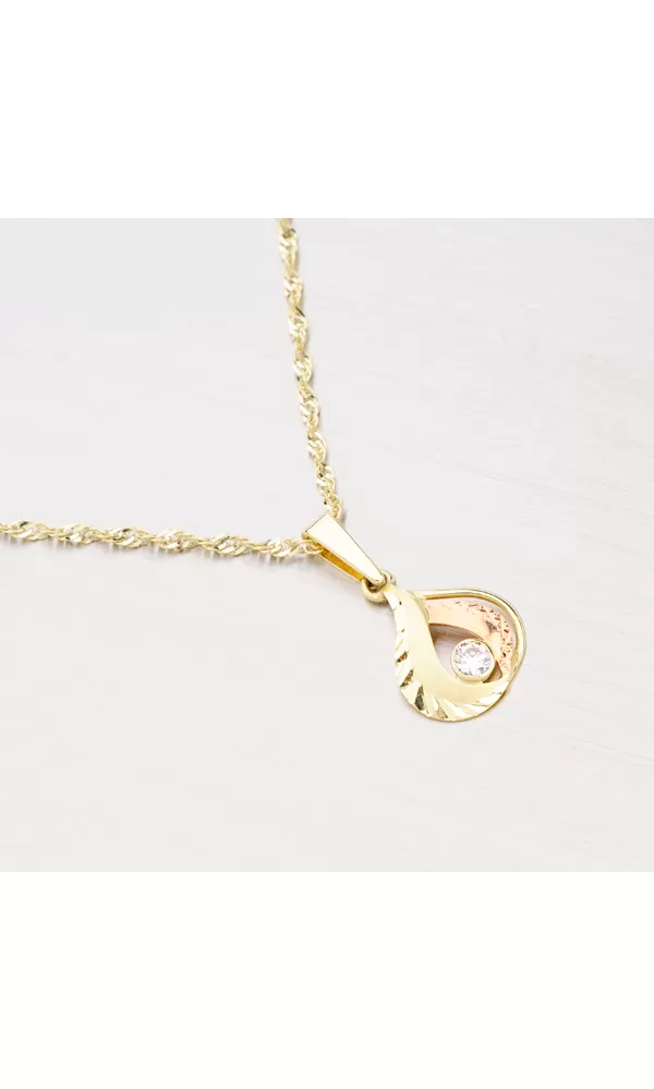 Propracovaný přívěsek je vyrobený tradiční klenotnickou technikou v kombinaci žlutého a červeného čtrnáctikarátového zlata 585/1000 v kombinaci lesklé a pískované povrchové úpravě. Přívěsek zdobí precizní ruční gravírování a bílý zirkon, který je umístěn ve spodní části přívěsku. Tento propracovaný kousek musíte mít. Bude se ve Vašem dekoltu krásně vyjímat.