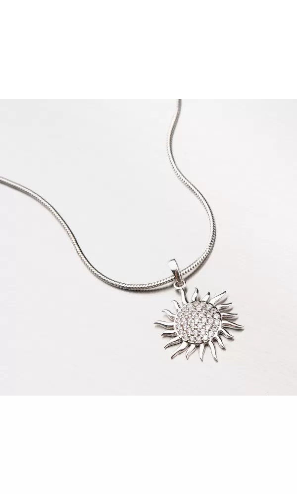 Přívěsek je vyrobený z bílého čtrnáctikarátového zlata 585/1000 v lesklé povrchové úpravě. Zlatý přívěsek je ve tvaru slunce, který se může pyšnit nádhernými paprsky a zirkony v briliantovém brusu, které jsou precizně vsazeny jeden vedle druhého. Tento přívěsek vám rozzáří dekolt.
