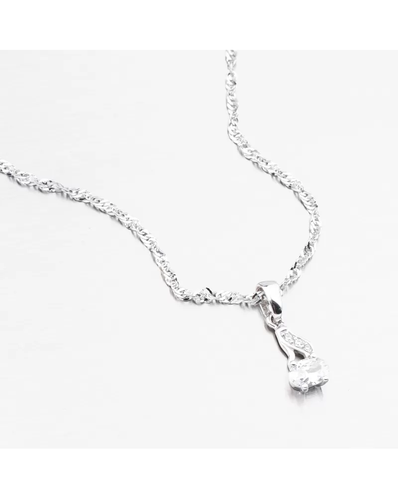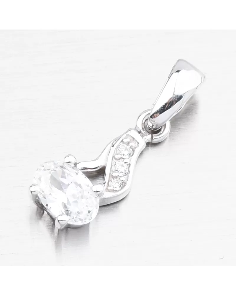 Zlatý přívěsek v elegantním designu uchvátí každou ženu. Přívěsku dominuje oválný zirkon ve spodní části upevněný pomocí čtyř krapen a poté nad ním vedou dvě linie, které se poté spojí do jedné. Silnější linie je osazena zářivými zirkony v briliantovém brusu. Tento brus zajišťuje zirkonům brilanci pravých diamantů.