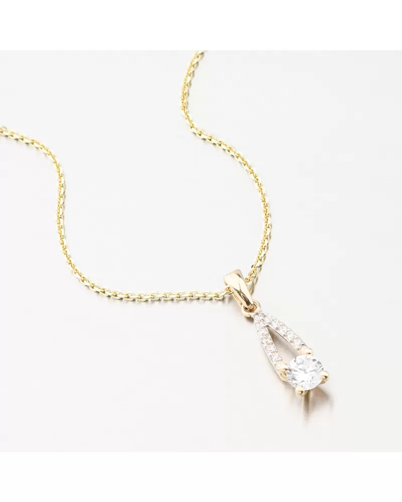 Elegantní zlatý přívěsek, kterým zaručeně zazáříte. Přívěsek má ve spodní části výrazný zirkon o velikosti 5 mm usazený pomocí čtyř krapen a poté vedou dvě boční linie osazené zirkony přímo k očku a připevnění na řetízek. Zirkony jsou briliantového brusu. Tento brus propůjčuje kamenům brilanci pravých diamantů. Krapny kolem drobných zirkonů umístěných jsou v bílé barvě zlata. Přívěsek se vám proto bude hodit, jak je zlatým šperkům, tak ke šperkům bílé barvy zlata.