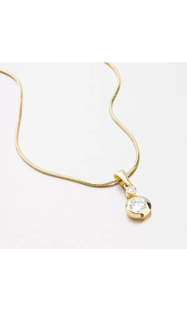 Elegantní přívěsek zdobí jeden velký zirkon v briliantovém brusu, který je pečlivě vsazen do zlata. Nad tímto velkým zirkonem je usazen menší zirkon v briliantovém brusu. Tento brus zajišťuje zirkonům brilanci pravých diamantů. Přívěsek je vyroben ze žlutého čtrnácti karátového zlata o ryzosti 585/1000 v lesklé povrchové úpravě.