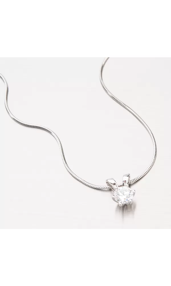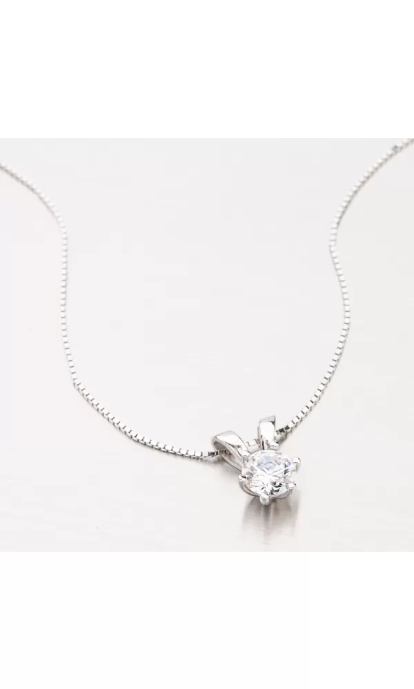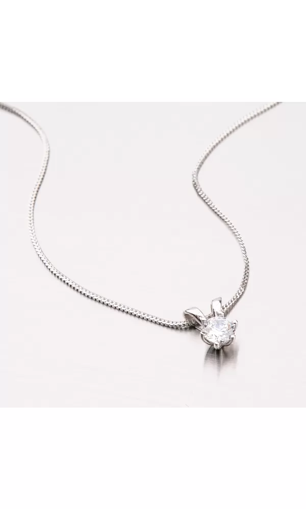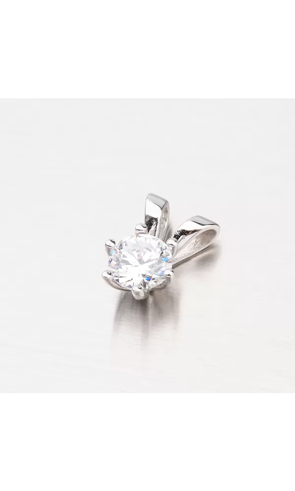 Jednoduchý ale velmi efektní přívěsek je vyrobený z bílého čtrnáctikarátového zlata 585/1000 v lesklé povrchové úpravě. Přívěsek je zdobený jedním velkým zirkonem o průměru 6,00, který je uchycen šesti krapnami. Přívěsek nemá klasické očko ale řetízek jde skrz přívěsek. Přívěsek tak dokonale splyne s vaším dekoltem.