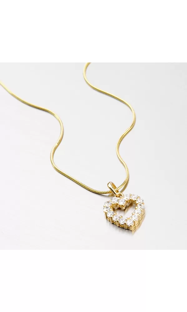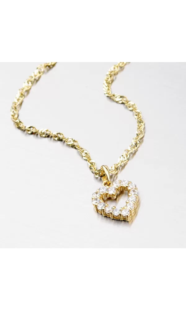 Romantický přívěsek ve tvaru srdíčka vyrobený ze čtrnácti karátového žlutého zlata o ryzosti 585/1000 udělá radost každé slečně. Přívěsek má lesklý povrch a je osazený čtrnácti zářivými zirkony v bílé barvě.