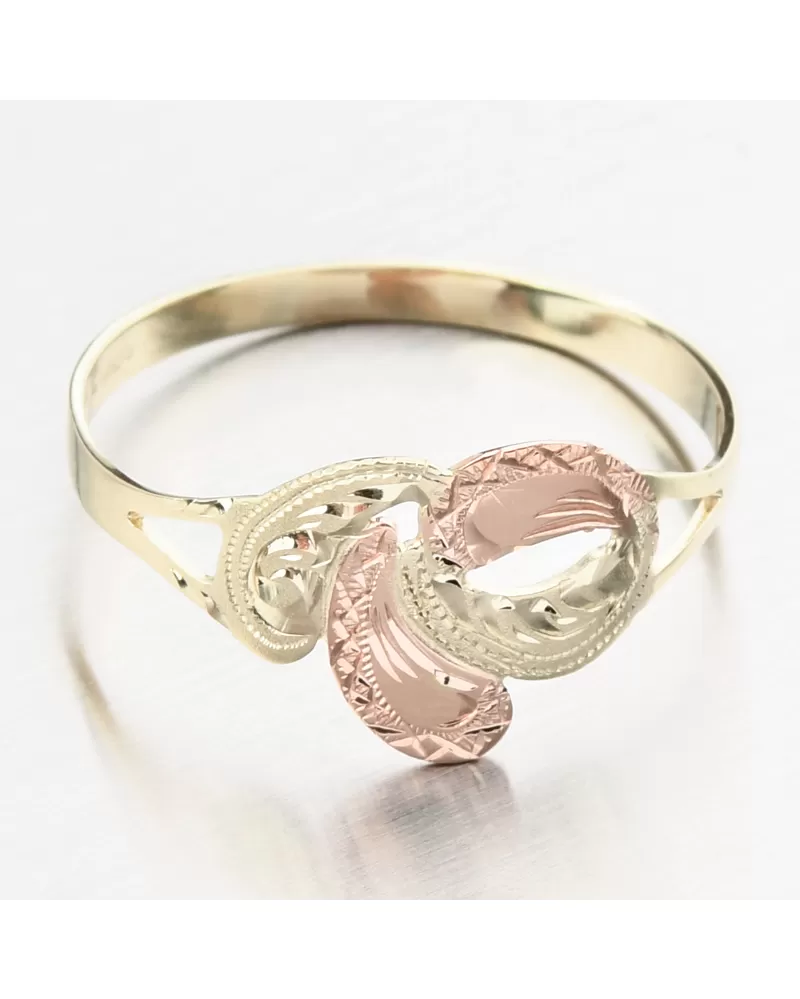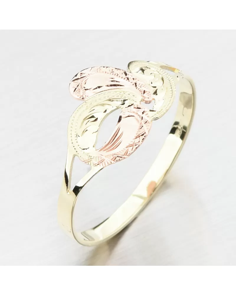 Dámský prsten je vyrobený tradiční klenotnickou technikou v kombinaci žlutého a červeného čtrnáctikarátového zlata 585/1000 . Prsten je vyroben v lesklé povrchové úpravě a je bohatě zdobený ručním rytím.