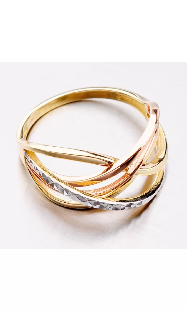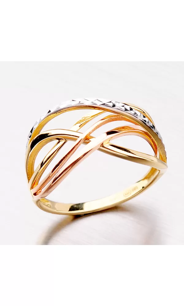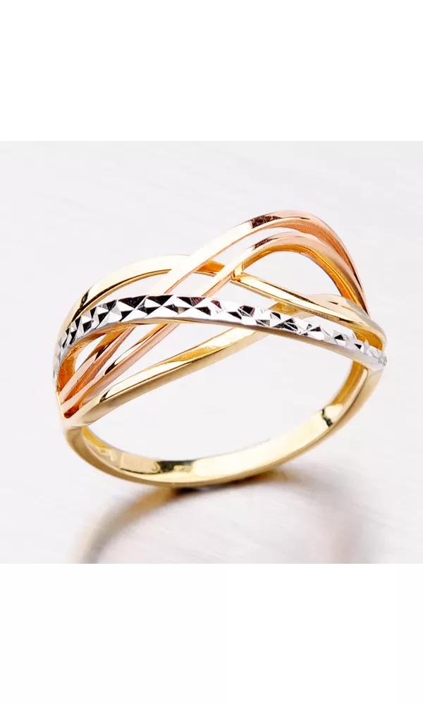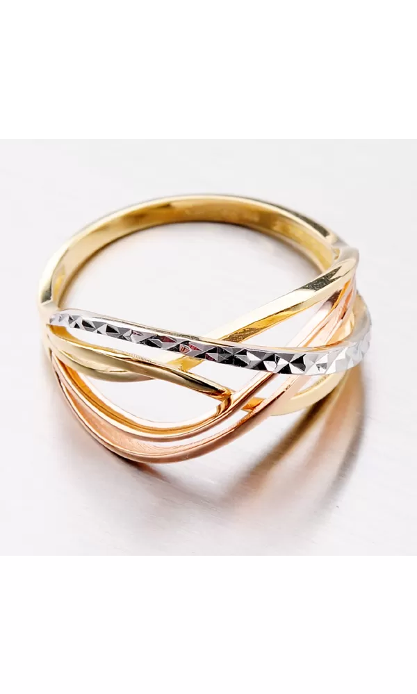 Originální šperk ve formě zlatého prstenu není k přehlédnutí. Prsten je složen s jednotlivých linii, které se od sebe liší barvou zlata. Jedna z linií v bílé barvě zlata je zvýrazněna gravírováním. Gravírování je za pomocí diamantového hrotu a dodávají šperku maximální lesk a brilanci ze všech úhlů.