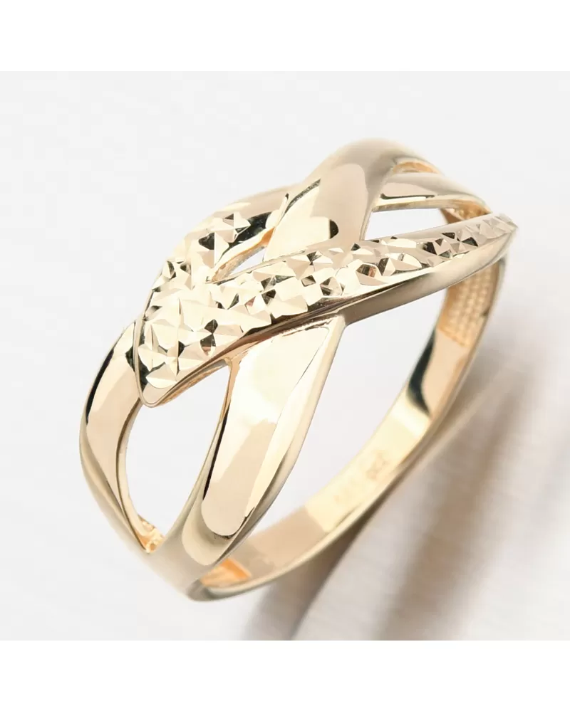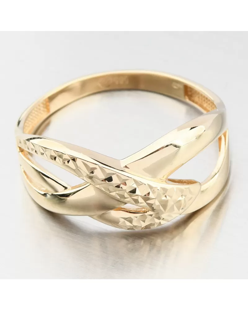 Tento půvabný zlatý prsten vyniká originálním proplétaným designem, který působí jemně a zároveň výrazně. Lesklý povrch v kombinaci s precizním zlatnickým gravírováním ve středové linii dodává prstenu luxusní vzhled a nadčasovou eleganci. Gravírování je provedeno diamantovým rycím hrotem, který zajišťuje nejvyšší možný lesk gravírovaných facet.