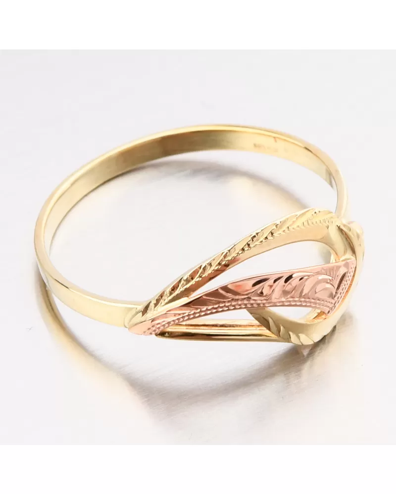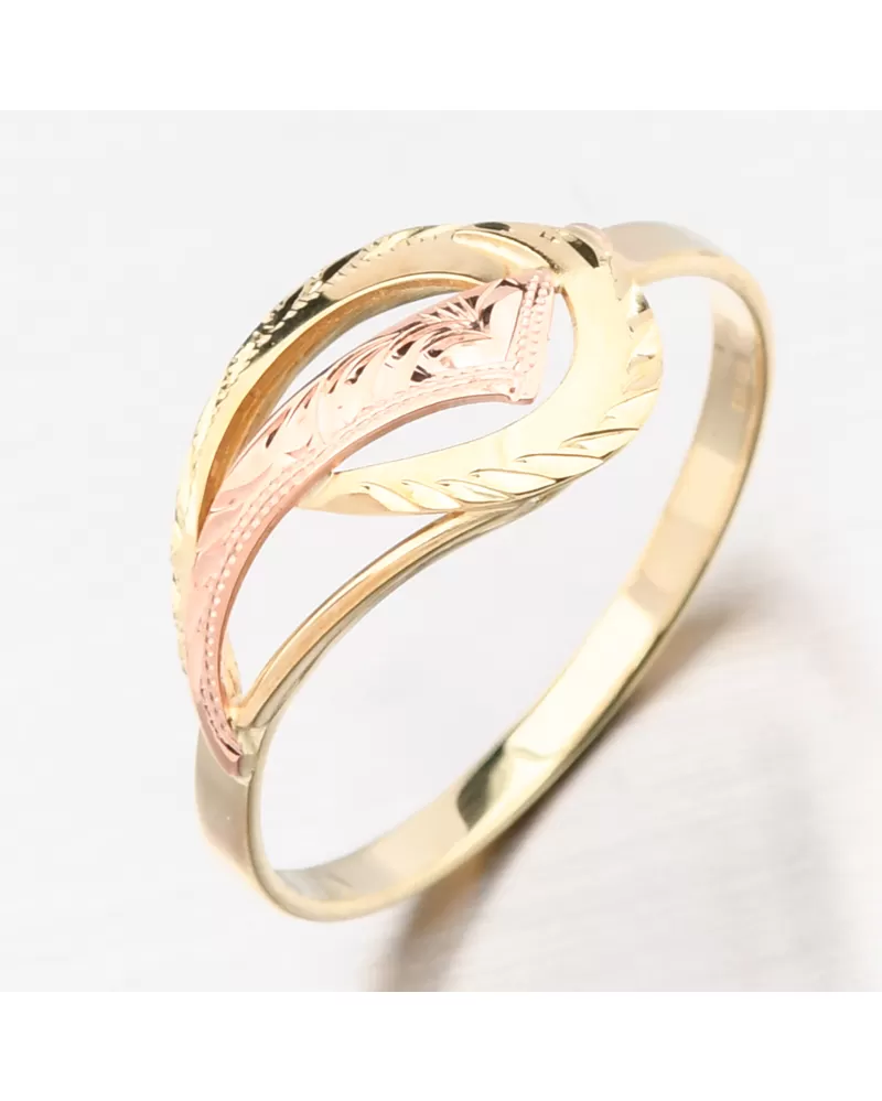 Dámský prsten vyrobený tradiční klenotnickou technikou v kombinaci žlutého a červeného čtrnáctikarátového zlata 585/1000 . Prsten je vyroben v lesklé povrchové úpravě a je bohatě zdobený ručním rytím.