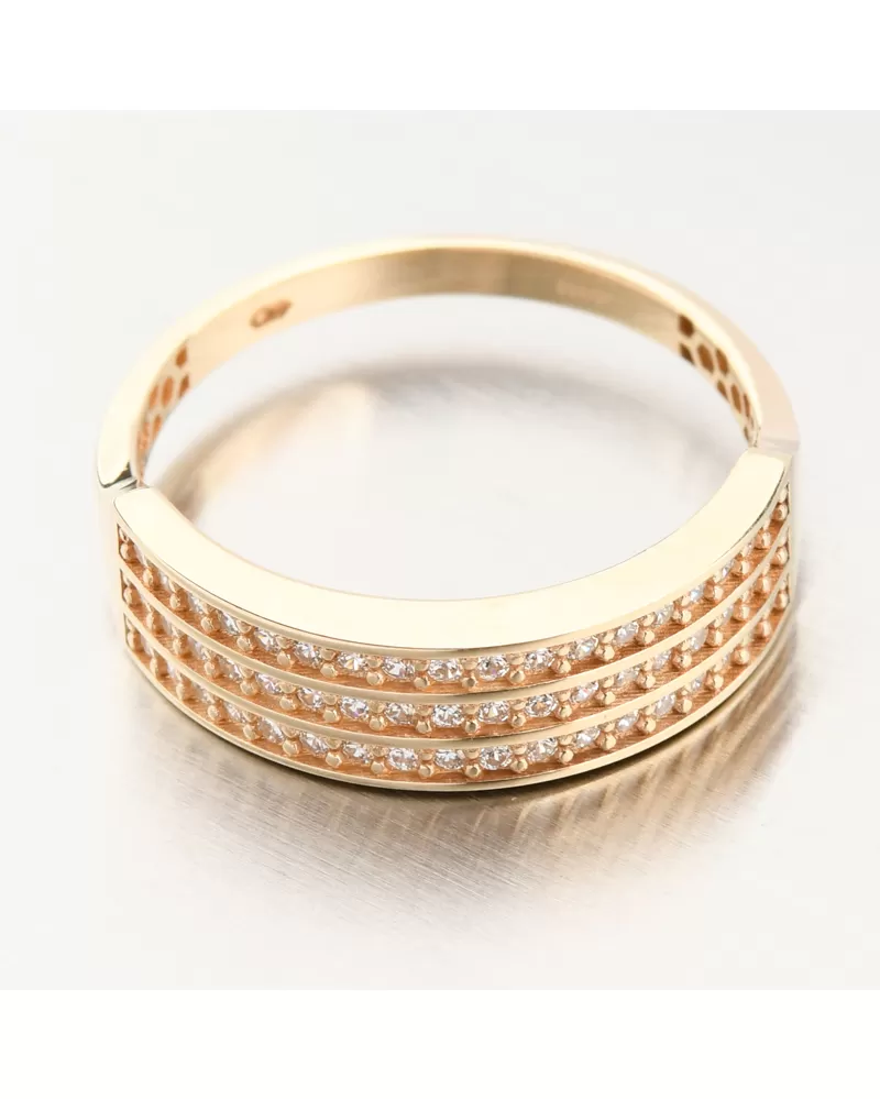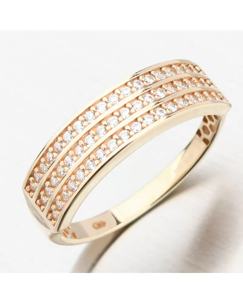 V jednoduchosti je krása, tento prsten je toho dokonalým důkazem. Zlatý prsten zdobený třpytivými zirkony ve třech řadách působí elegantně, decentně a přesto nepřehlédnutelně. Precizní osazení zirkonů vytváří jemný souvislý lesk, který rozzáří každý pohyb ruky. Zirkony jsou briliantového brusu, který zajišťuje maximální brilanci vybroušených facet, dokonale odráží světlo a neuvěřitelně září z každého úhlu pohledu.