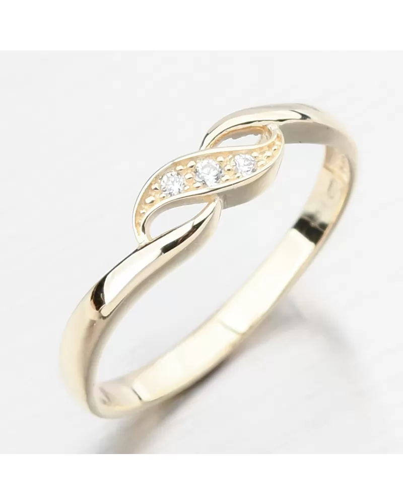 Tento krásný dámský prsten je vyrobený ze žlutého čtrnácti karátového zlata o ryzosti 585/1000 s lesklou povrchovou úpravou. Prsten je zdobený vlnkou ve které jsou vsazeny tři bílé zirkony v briliantového tvaru, které zaručují maximální lesk prstenu ze všech úhlů.