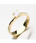 Na tento stylový dámský prsten bylo použito čtrnácti karátového žluté zlato o ryzosti 585/1000. Prsten je vyrobený v lesklé povrchové úpravě a je osazen jedním zářivým zirkonem v bílé barvě, který je vsazen do čtyř-krapnové korunky. Prsten vám zaručeně bude dělat radost. Tento šperk byl zkontrolován puncovním úřadem, který ověřil jeho kvalitu a označil státním puncem pro danou ryzost.