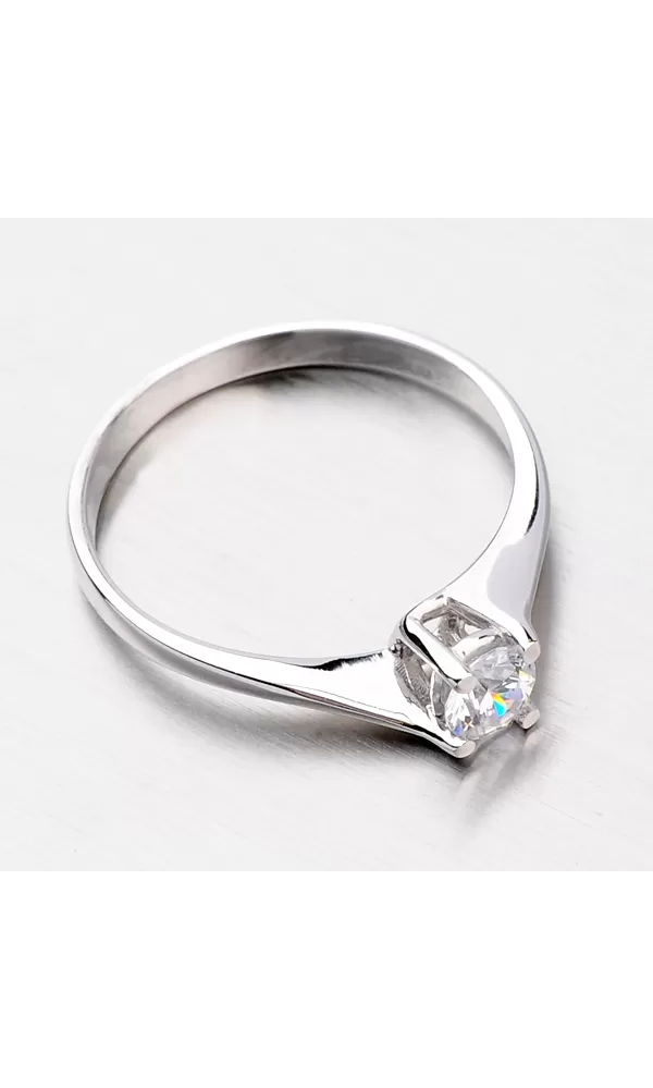 Krásný dámský prsten vyrobený z bílého čtrnácti-karátového zlata o ryzosti 585/1000 v lesklé povrchové úpravě s jedním kulatým zirkonem briliantového brusu v bílé barvě. Tento šperk byl zkontrolován puncovním úřadem, který ověřil jeho kvalitu a označil státním puncem pro danou ryzost.